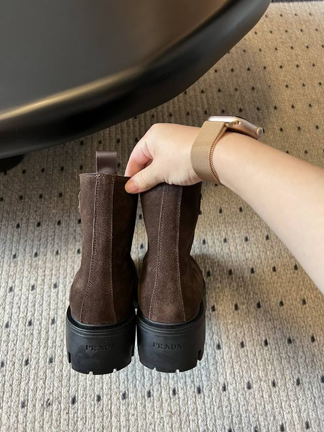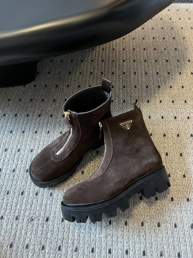Prad* 25Ss 秋冬新款拉链短靴厚底靴子 这季的鞋子真的好看的,奶茶色系很适合初秋,新款鞋型洋气时髦,时尚厚底休闲长靴 ,独到味道,人人都爱也轻松驾驭 每年都会爆.还有就是百搭经典的鞋楦,足以征服你,穿上它,增高休闲两不失误,上脚简单帅气 鞋面:牛反绒 内里:牛皮 大底:原版开模大底 Size:35-40 40定制不退换