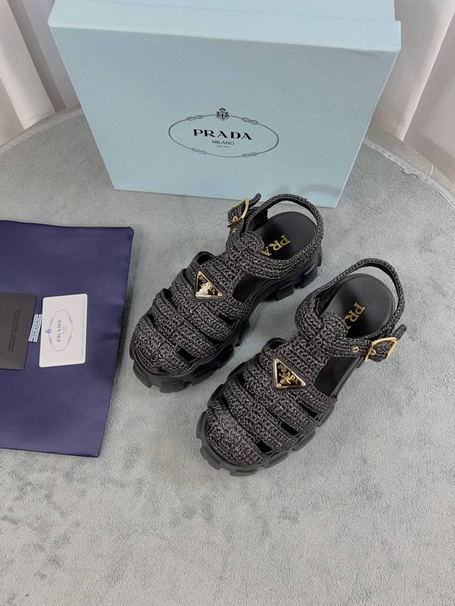 Prada新款编织凉鞋,顶级版本 面:原版定制拉菲草 里:进口小牛皮 底:原版1:1开模橡胶发泡底 跟高:6Cm 标志性的金属三角标 Size:35-40 41
