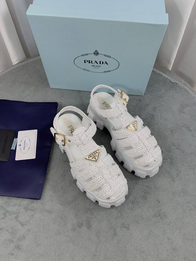 Prada新款编织凉鞋,顶级版本 面:原版定制拉菲草 里:进口小牛皮 底:原版1:1开模橡胶发泡底 跟高:6Cm 标志性的金属三角标 Size:35-40 41