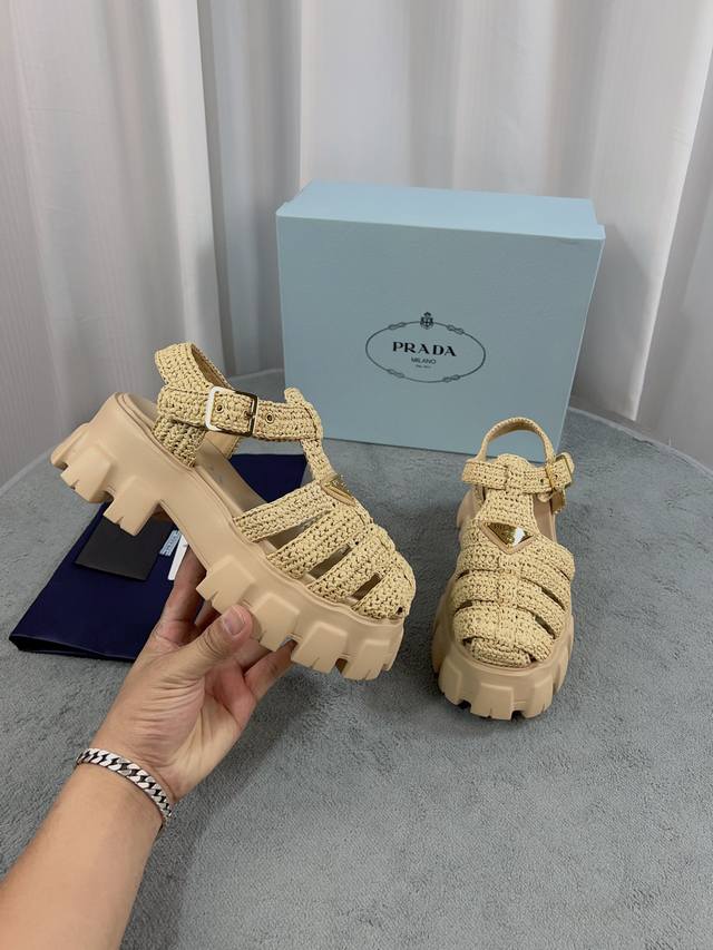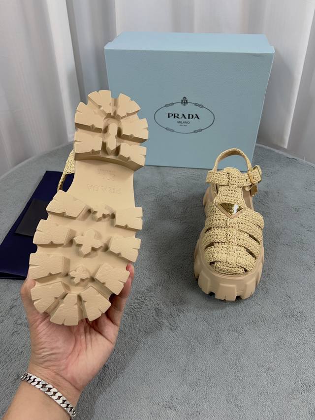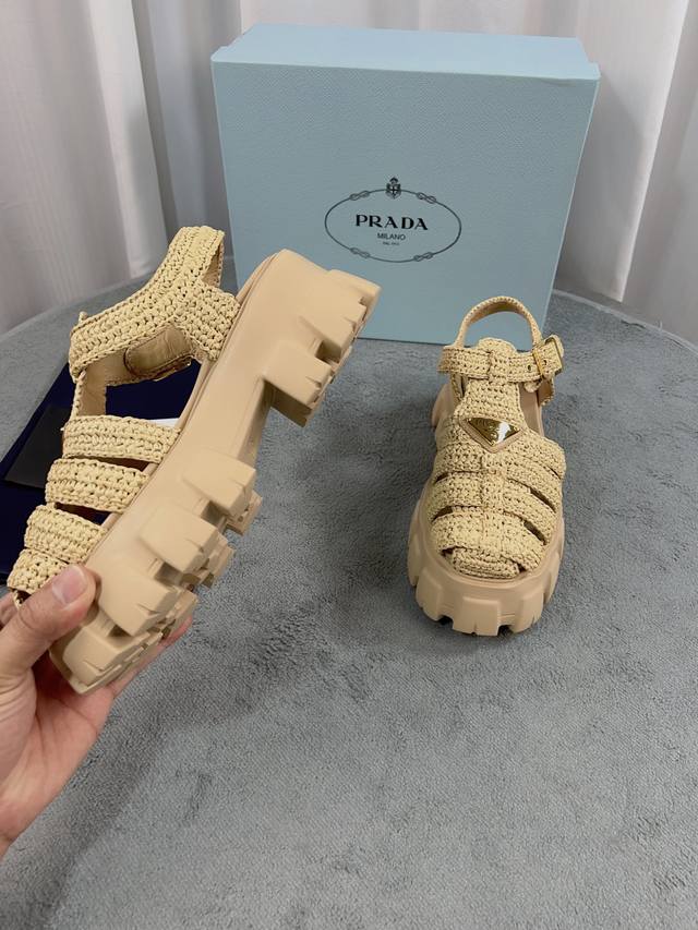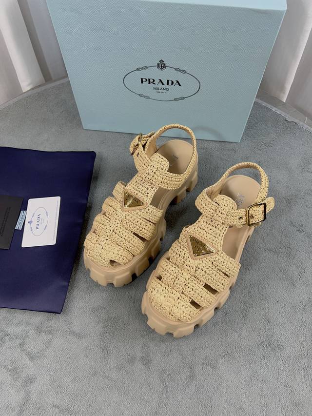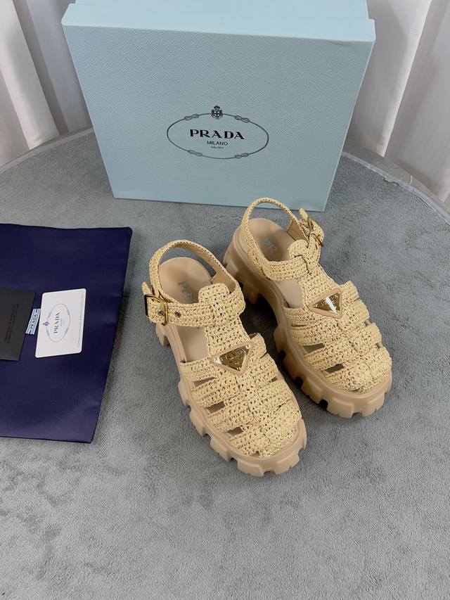 Prada新款编织凉鞋,顶级版本 面:原版定制拉菲草 里:进口小牛皮 底:原版1:1开模橡胶发泡底 跟高:6Cm 标志性的金属三角标 Size:35-40 41定做