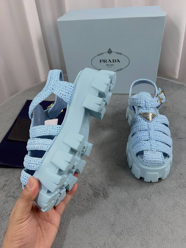 Prada新款编织凉鞋,顶级版本 面:原版定制拉菲草 里:进口小牛皮 底:原版1:1开模橡胶发泡底 跟高:6Cm 标志性的金属三角标 Size:35-40 41定做