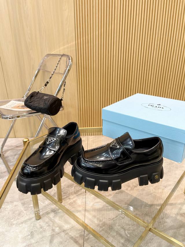 Prada普拉达新款黑色开边珠小牛皮+牛皮垫脚厚底休闲小皮鞋,Prad这款松糕厚底鞋今年非常火爆,穿上 增高 休闲两不失误,清爽的表现足以表达对鞋子的个个细节的把控, 面料:进口开边珠+软漆牛皮 牛皮内里, 厚底松糕鞋,带Logo 防滑鞋底,这款鞋子上脚非常舒服,脚感很棒 跟高6Cm 码数:35-44#