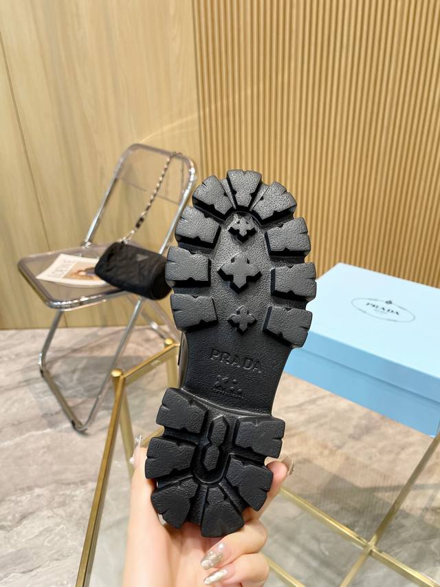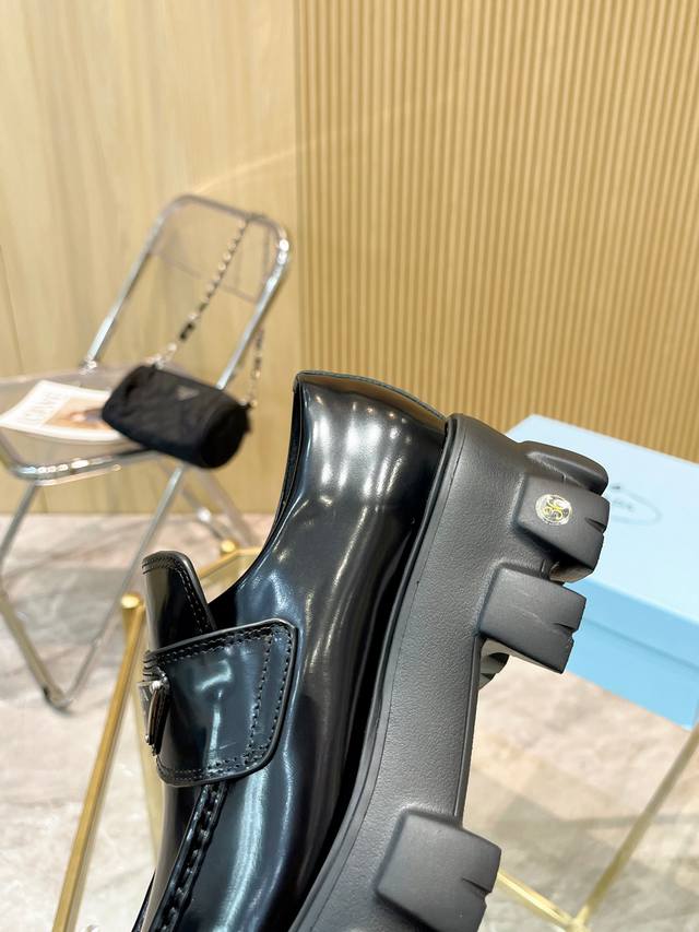 / Prada普拉达新款黑色开边珠小牛皮+牛皮垫脚厚底休闲小皮鞋,Prad这款松糕厚底鞋今年非常火爆,穿上 增高 休闲两不失误,清爽的表现足以表达对鞋子的个个细节的