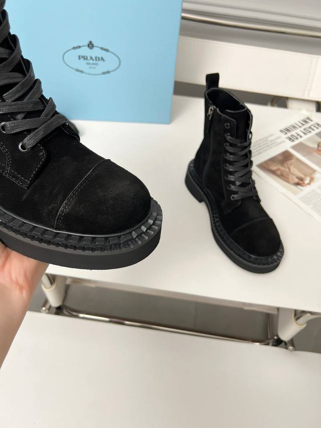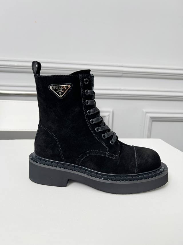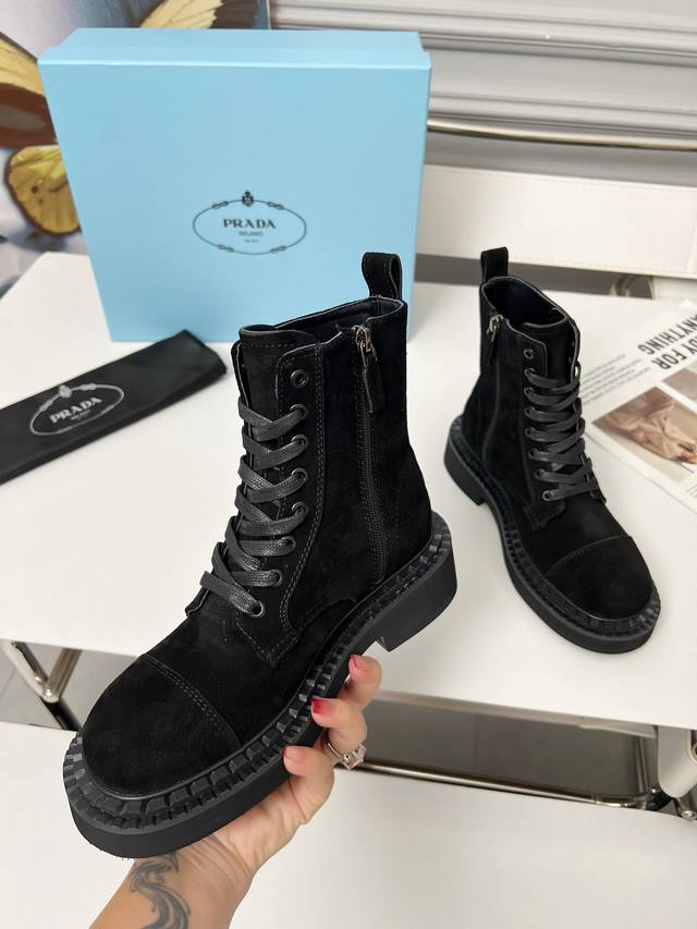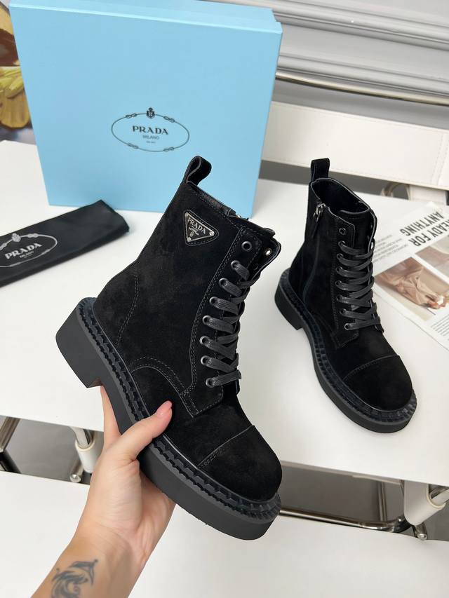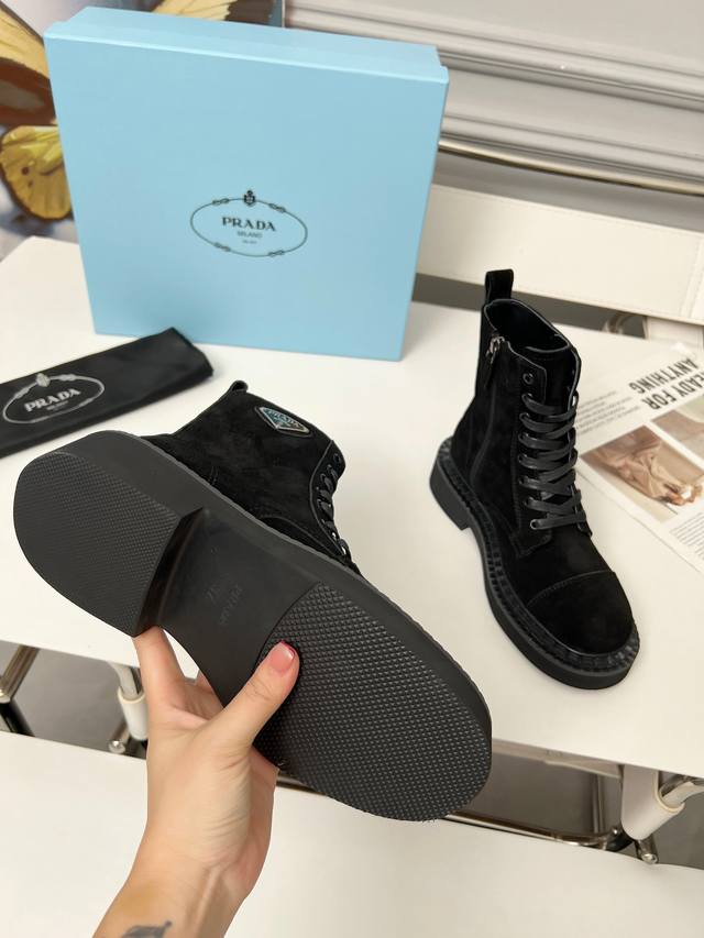 Prada普拉达经典三角标王炸马丁靴。今年的大爆款。上脚大气显腿瘦,全系列采用多种进口材料:小牛皮,开边珠,牛反绒高丝光,内里水染羊皮!!发泡底轻便舒适。 码数:35-41 41定做不退换 出厂价Pp: