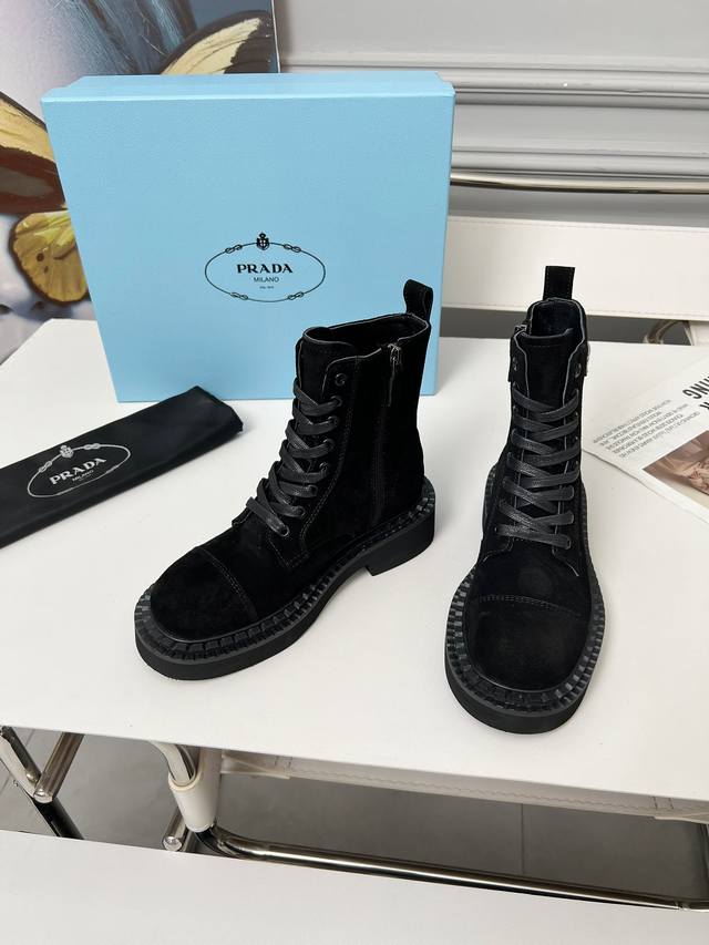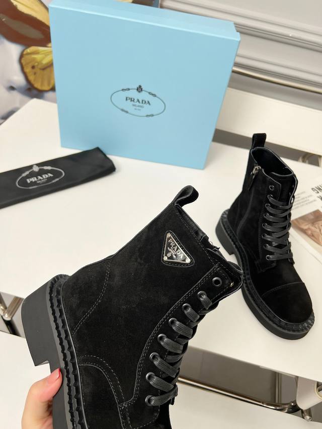 Prada普拉达经典三角标王炸马丁靴。今年的大爆款。上脚大气显腿瘦,全系列采用多种进口材料:小牛皮,开边珠,牛反绒高丝光,内里水染羊皮!!发泡底轻便舒适。 码数