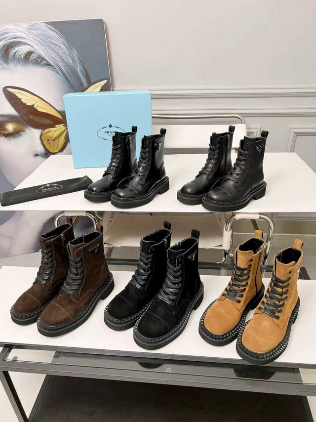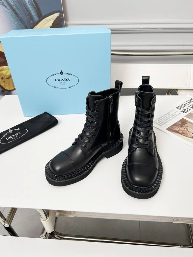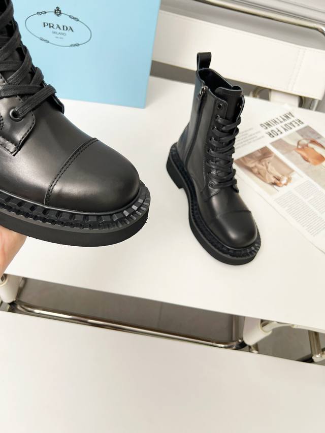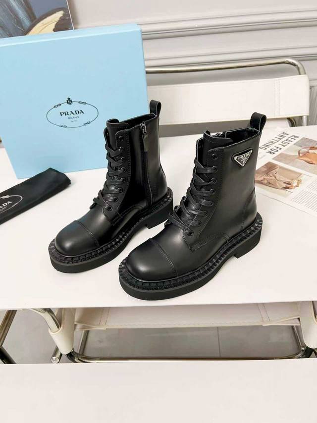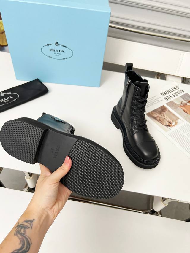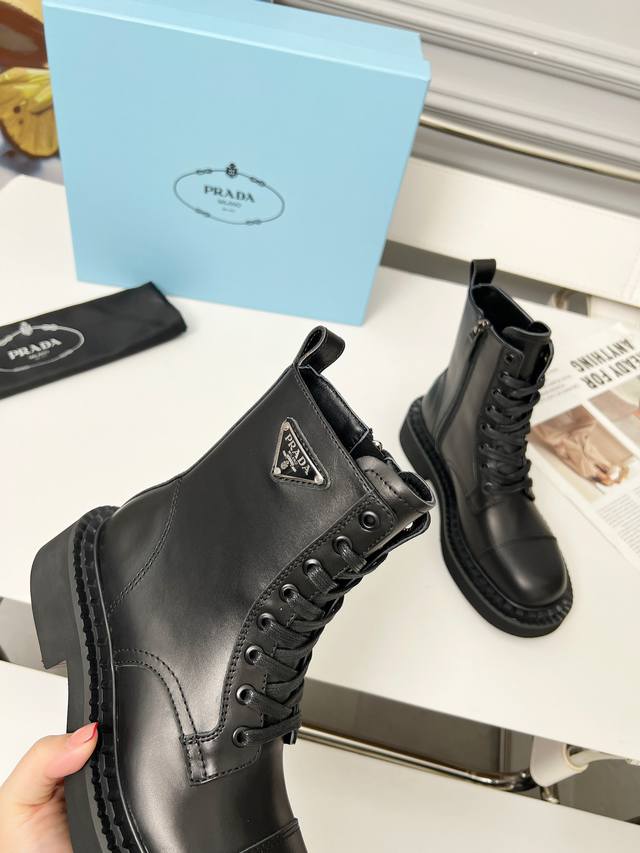 Prada普拉达经典三角标王炸马丁靴。今年的大爆款。上脚大气显腿瘦,全系列采用多种进口材料:小牛皮,开边珠,牛反绒高丝光,内里水染羊皮!!发泡底轻便舒适。 码数