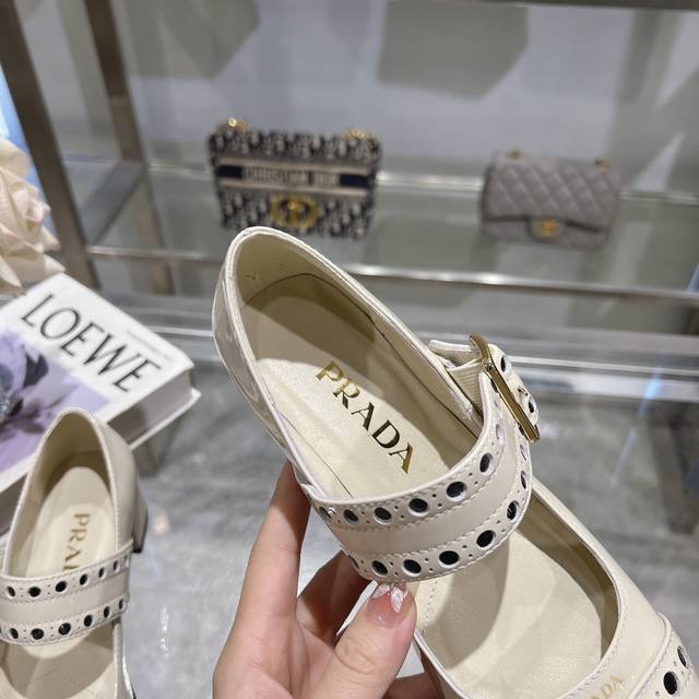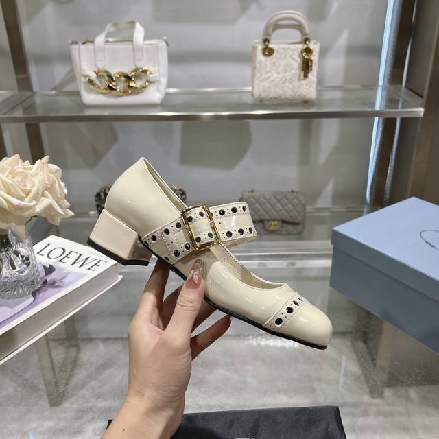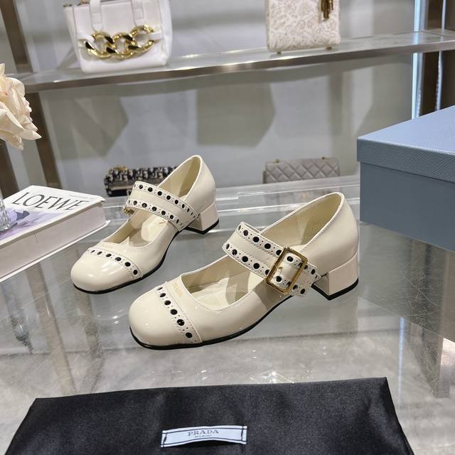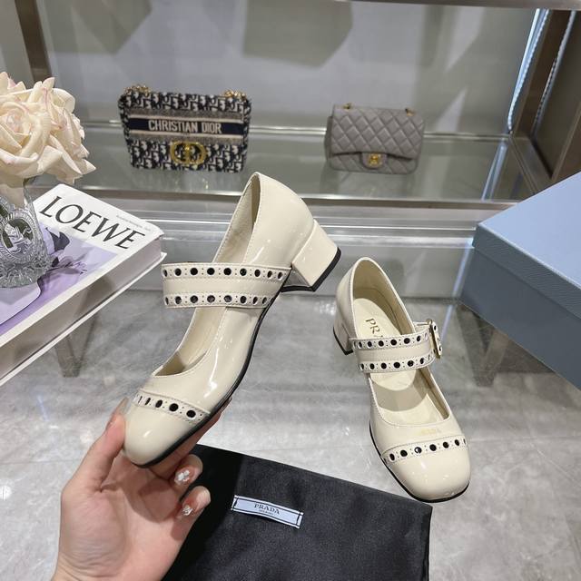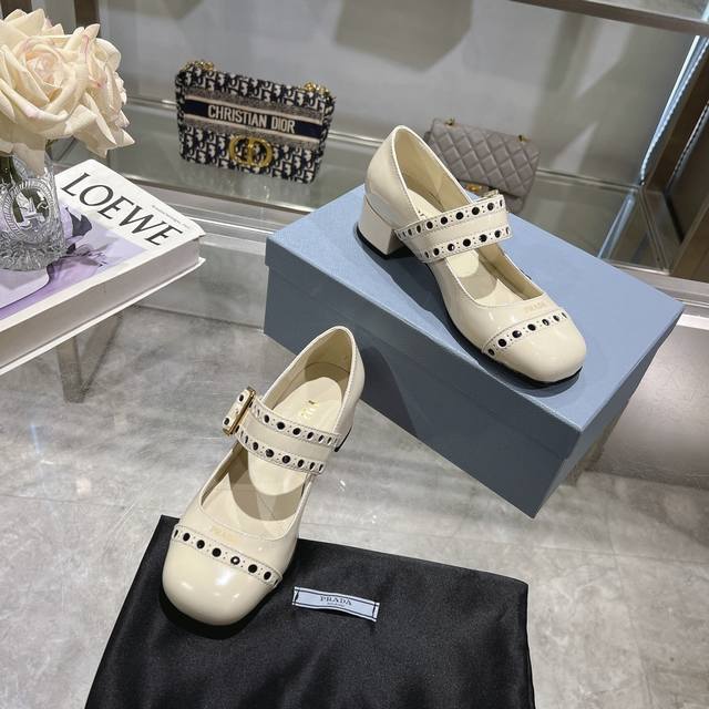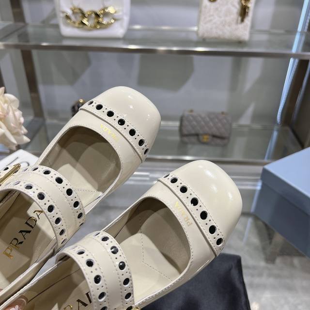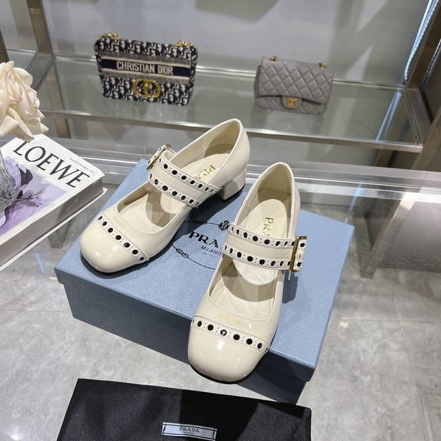/ Prada 普拉达 25年新款 走秀款方圆头冲孔玛丽珍粗跟单鞋。工厂P价P 这款时尚的高跟鞋采用漆面皮革制成,饰以穿孔装饰,对比鲜明的色彩彰显复古风范。鞋面采用