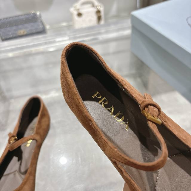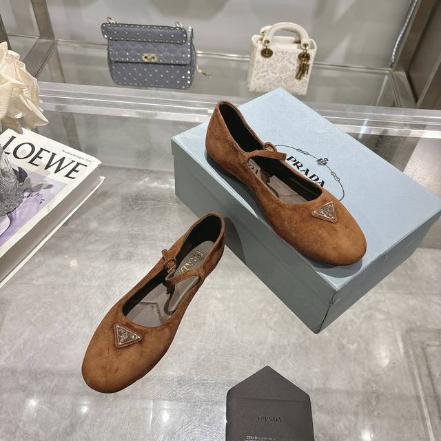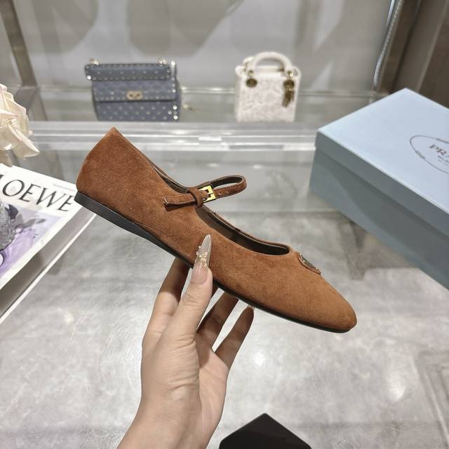 Prada 普拉达2025Ss春夏新品 闪亮登场 玛丽珍平底芭蕾舞鞋 柔软舒适 ,小红书各大博主推荐,妥妥的学院风通勤1-1开发 圆头金色三角标扣 出厂价P 面料 :羊猄,羊皮里 码数:35一40 41定做不退换