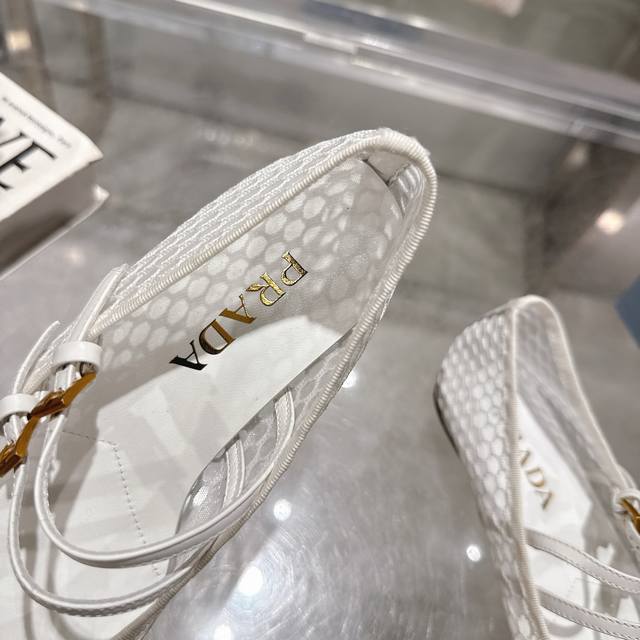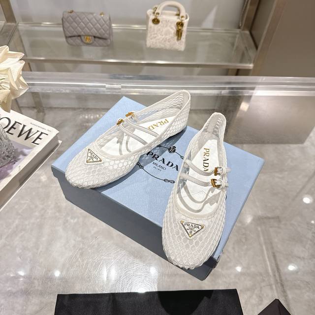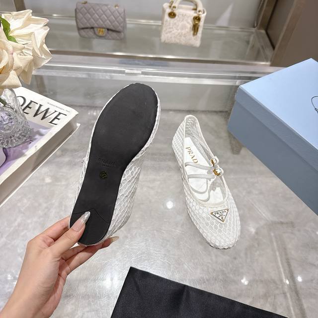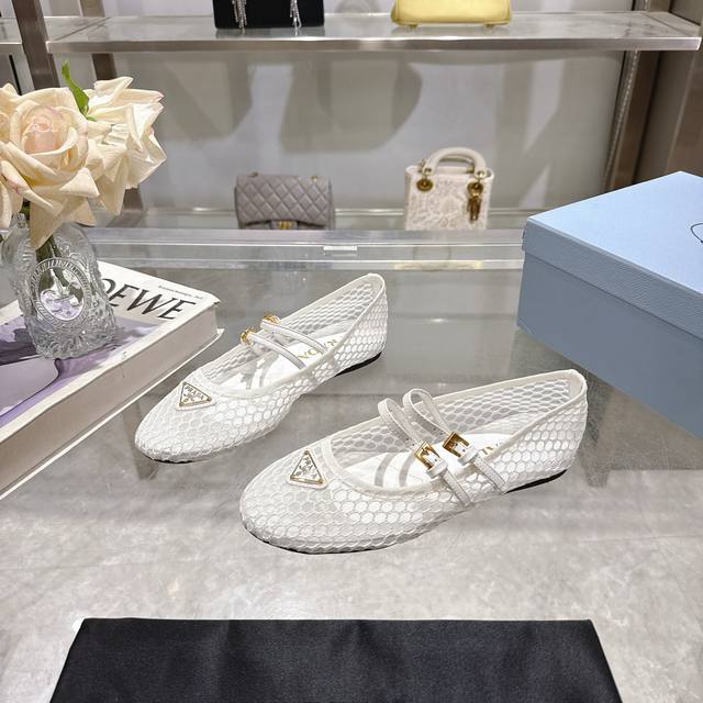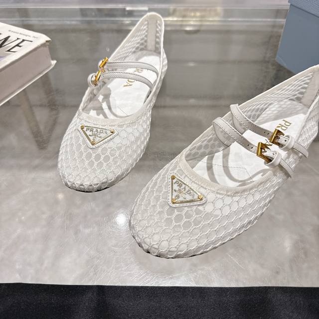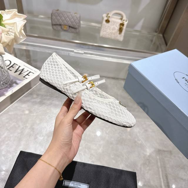 Prada 普拉达2025Ss春夏新品 闪亮登场 玛丽珍平底芭蕾舞鞋 柔软舒适 ,小红书各大博主推荐,妥妥的学院风通勤1-1开发 圆头金色三角标扣 出厂价P 面料 :透气纱网 羊皮内里 码数:35一40 41定做不退换