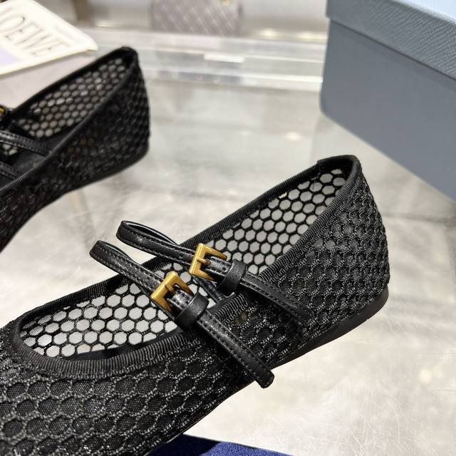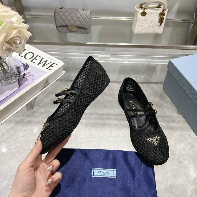 Prada 普拉达2025Ss春夏新品 闪亮登场 玛丽珍平底芭蕾舞鞋 柔软舒适 ,小红书各大博主推荐,妥妥的学院风通勤1-1开发 圆头金色三角标扣 出厂价P 面料 :透气纱网 羊皮内里 码数:35一40 41定做不退换