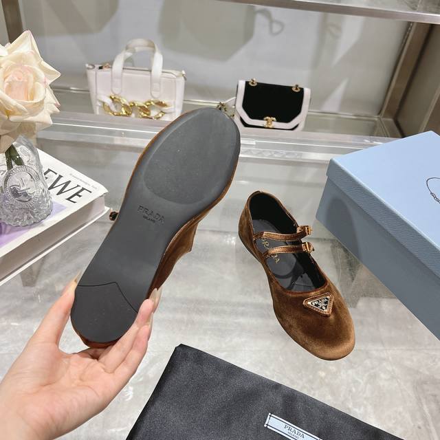 Prada 普拉达2025Ss春夏新品 闪亮登场 玛丽珍平底芭蕾舞鞋 柔软舒适 ,小红书各大博主推荐,妥妥的学院风通勤1-1开发 圆头金色三角标扣 出厂价P 面料 :天鹅绒、羊皮里 码数:35一40 41定做不退换