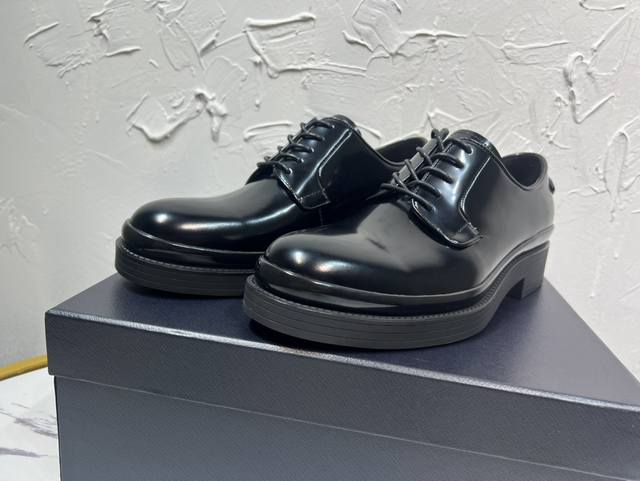 Prada Derby2025春最新款普拉达擦色复古乐福鞋,英伦风细带商务鞋,顶级版本厚底三角标德比鞋Ken同款,大底橡胶底,面料进口开边珠,牛皮里,牛皮垫脚黑红蓝三色全套包装码数39-46