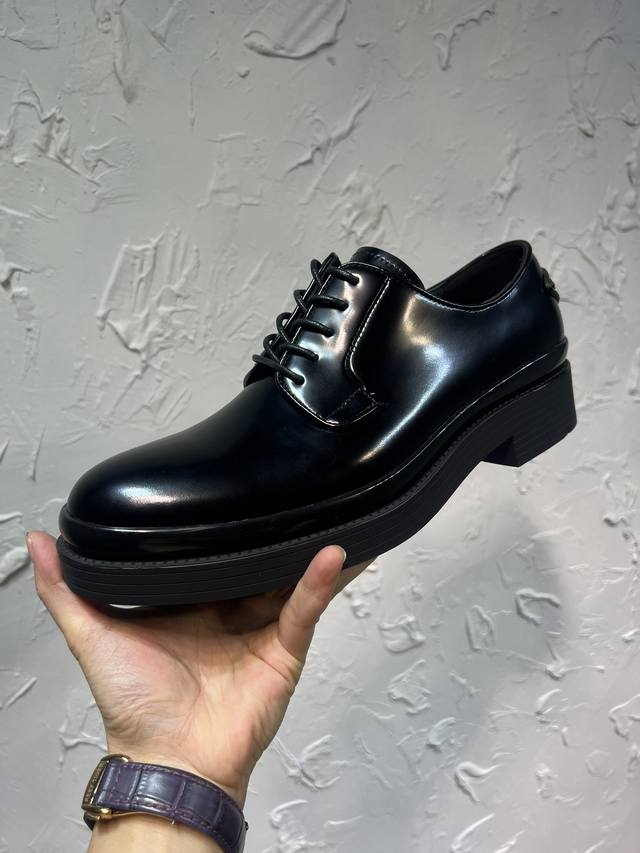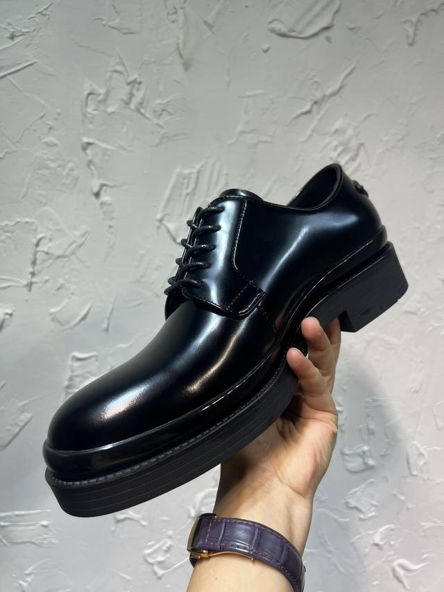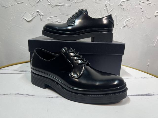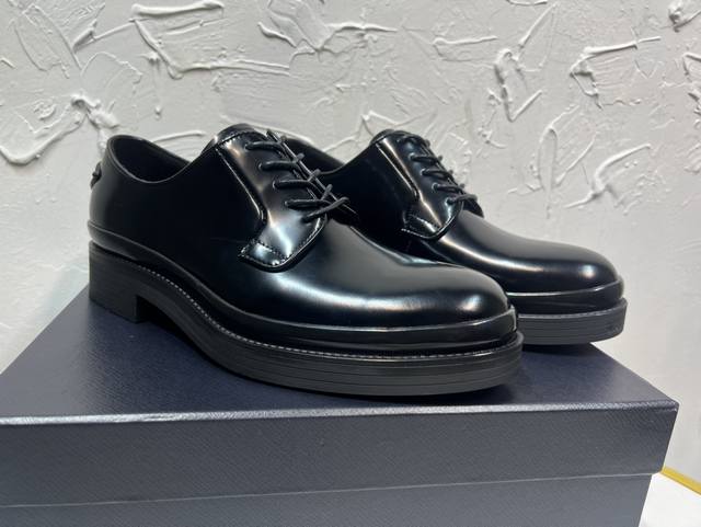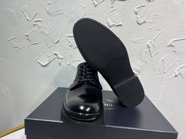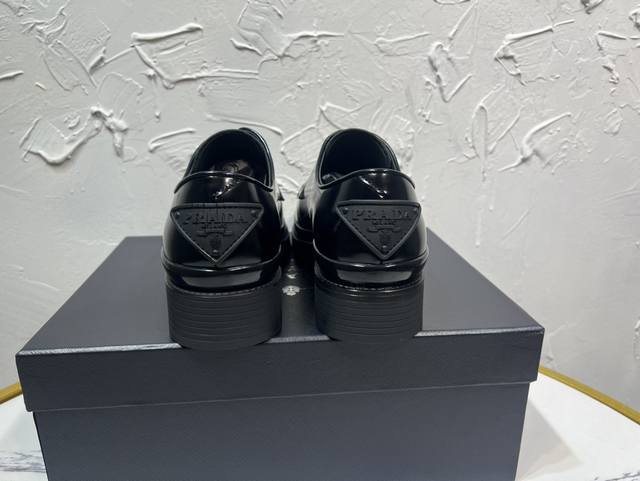 / Prada Derby2025春最新款普拉达擦色复古乐福鞋,英伦风细带商务鞋,顶级版本厚底三角标德比鞋Ken同款,大底橡胶底,面料进口开边珠,牛皮里,牛皮垫脚黑