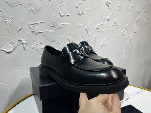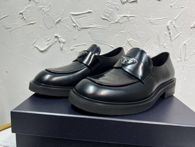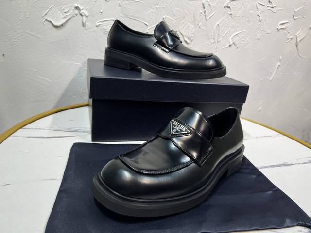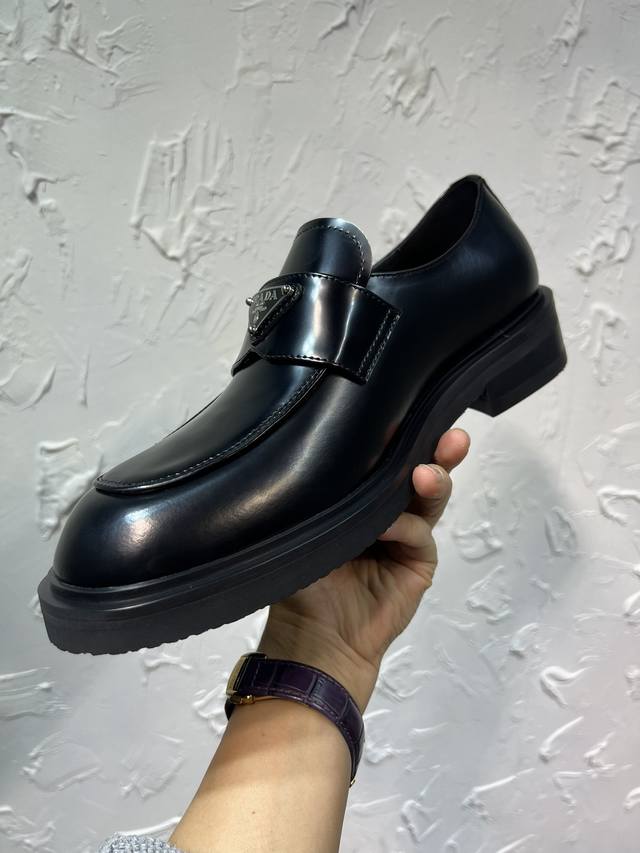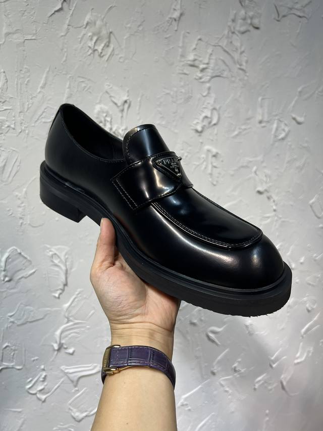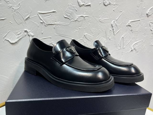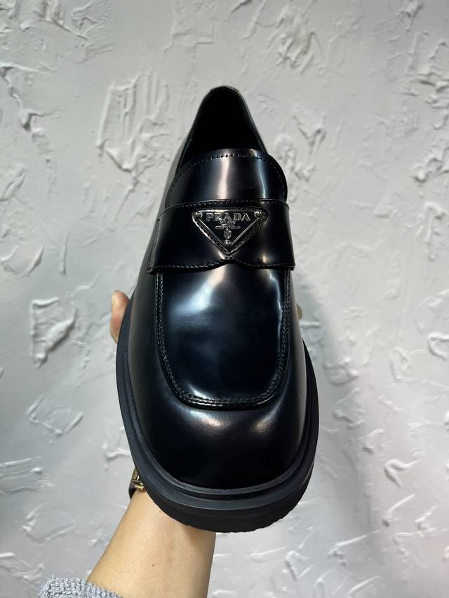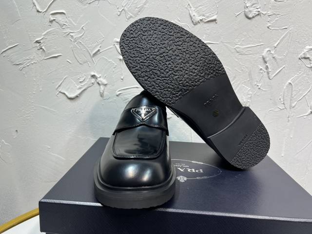 Prada Derby2025最春新款普拉达乐福鞋,英伦风商务鞋,顶级版本厚底三角标德比鞋Ken同款,大底Ev发泡橡胶底,面料进口开边珠,牛皮里,牛皮垫脚全套包装码数39-46