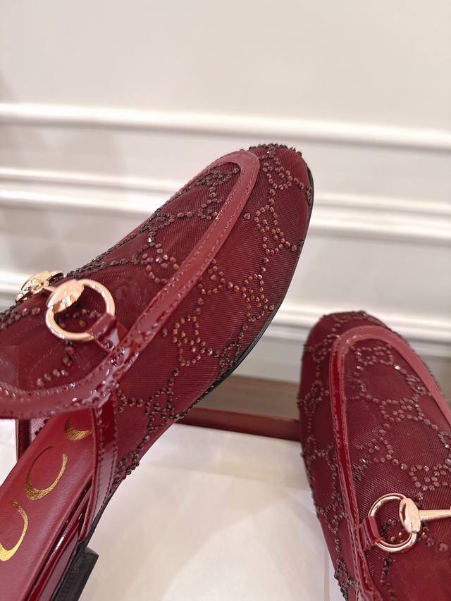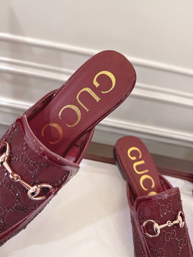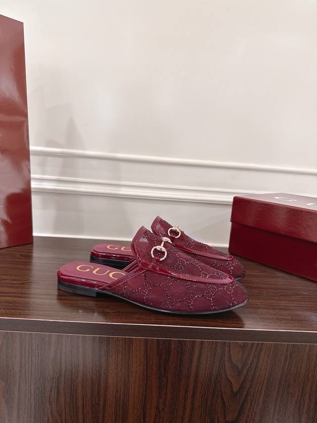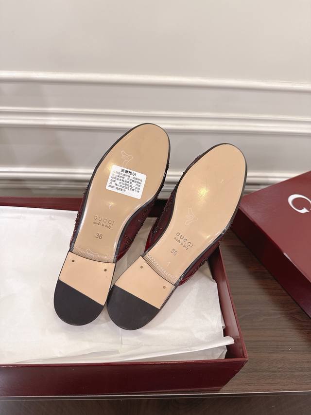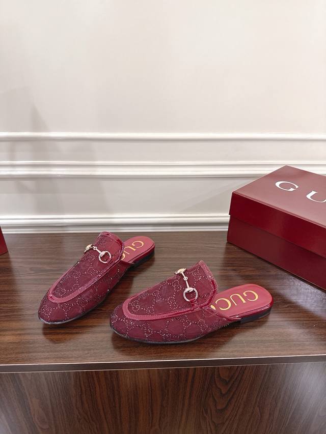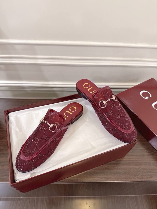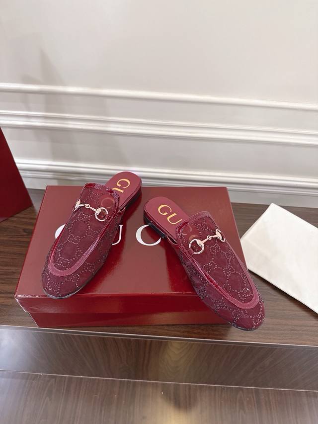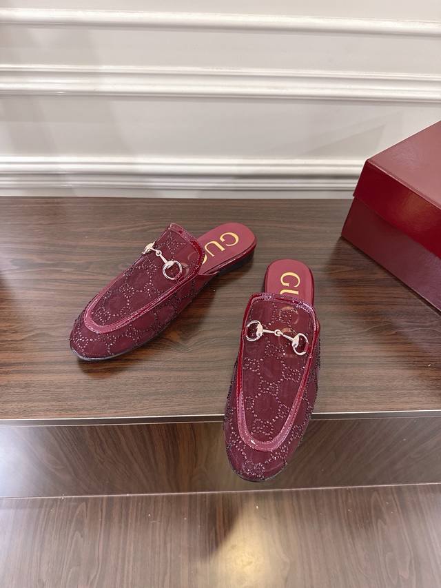 Princetown系列女士网纱水晶钻半拖鞋Princetown系列拖鞋采用品牌经典的网纱水晶钻,配以标志性的金色调马衔扣,呈现震撼效果。 原版定制网纱水晶钻 内里定制羊皮 真皮大底 码数34-42 34 40 41 42定做不退换 胶底190 真皮底