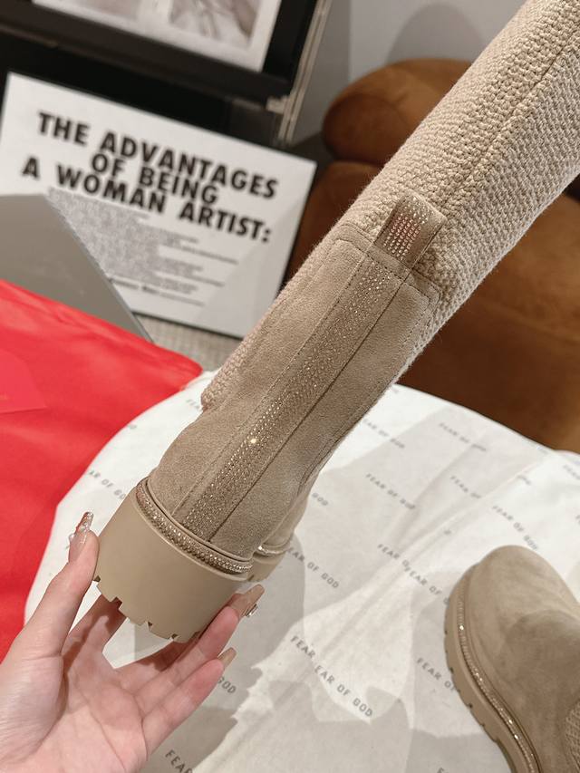 Rene Caovilla秋冬新款袜靴舒适百搭又时髦秋冬必备短靴!一见钟情的袜靴来啦 麂皮拼接针织设计包裹性超好 小腿粗的宝子们也豪无压力 气质甜美 时尚潮流 任何场所各种搭配都可以随意驾驭 鞋边满圈水晶精致感满满 穿上秒变大长腿 一脚蹬厚底粗跟切尔西短靴 简单帅气的机车靴设计 永不过时 圆头设计和弹力袜筒鞋面和鞋底的交界处通过三排水钻组成的装饰加以强调,为这个机车靴的款式带来了休闲感。坚韧不拔的都市风与活泼动人的闪亮触感之间的巧妙融合。经典的机车靴设计,弹力袜筒和后提环设计方便穿脱,更凸显出线条美 显瘦