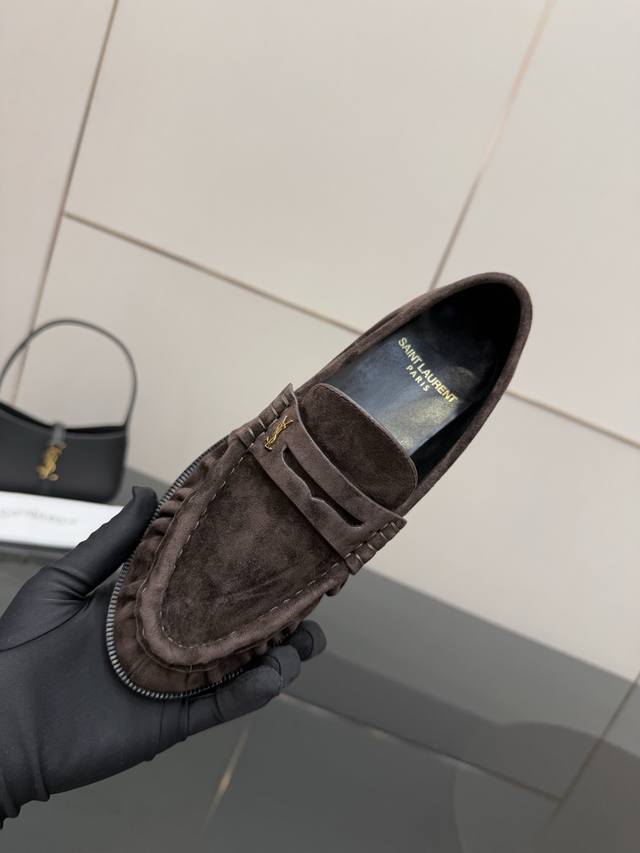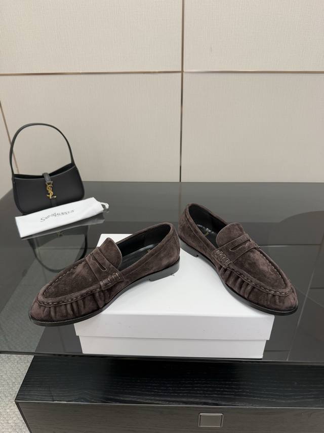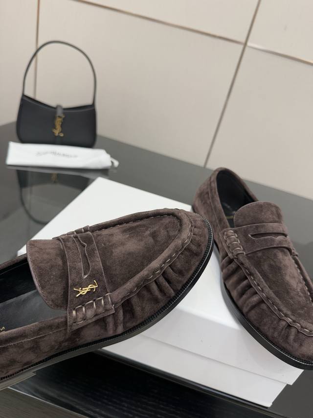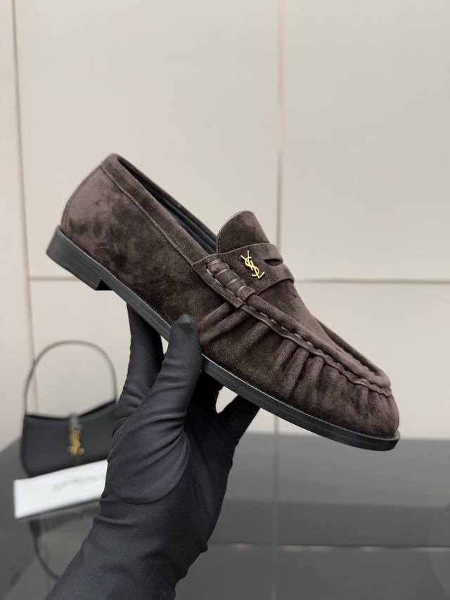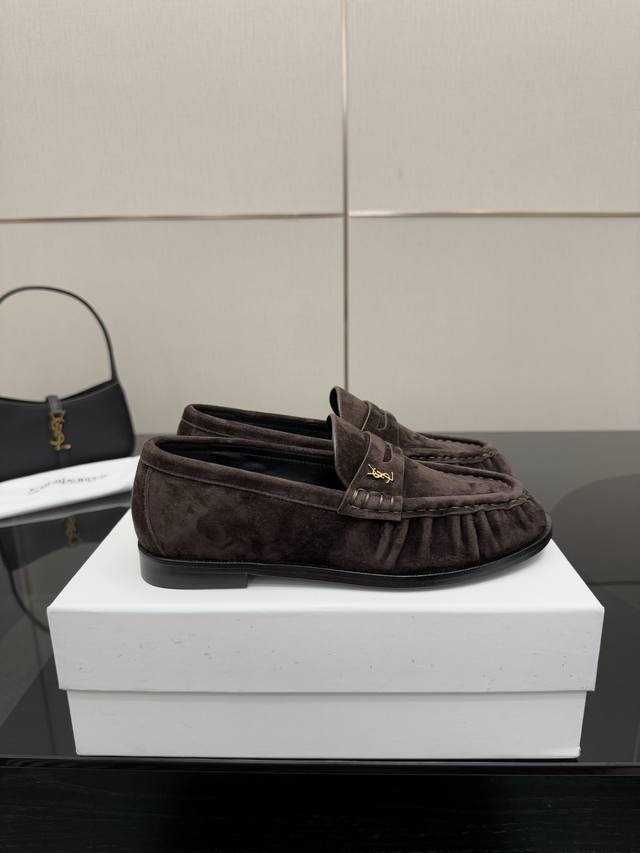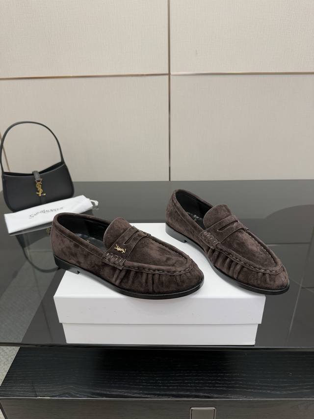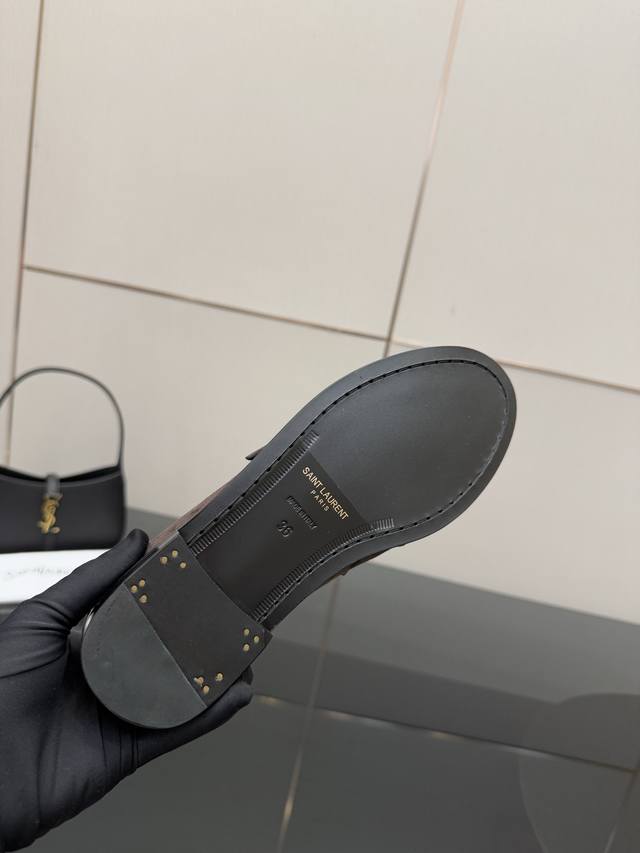 Saint Lauren*Ysl圣罗兰25Ss新品 Ysl小Logo乐福鞋单鞋 标志性的小Logo是这双鞋的灵魂所在 以低调而精致的姿态呈现于鞋身之上。 不同于张扬的大标识 它安静却醒目 用简洁线条勾勒出Ysl独有的时尚Dna 在不经意间透露出品牌的深厚底蕴 鞋头的经典杏仁形设计 巧妙修饰脚型 在视觉上拉长足部线条 彰显优雅与秀气 。 无论是搭配简约阔腿裤 还是俏皮小短裙 都能轻松驾驭 展现不同风格魅力 成为造型中的点睛之笔。 面料采用原版定制皮料 内里垫脚均为羊皮 意大利进口真皮大底 Size:35-3