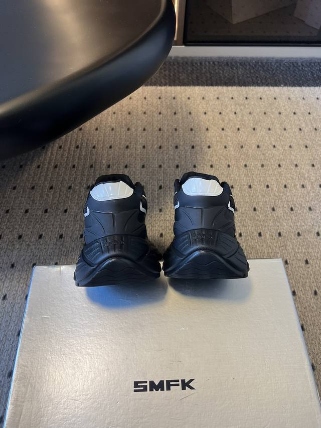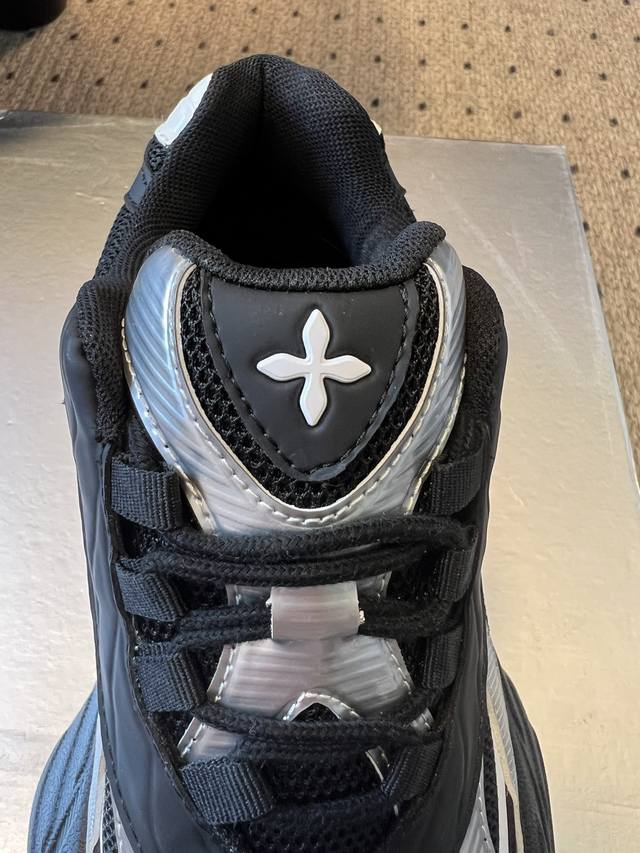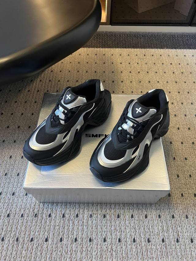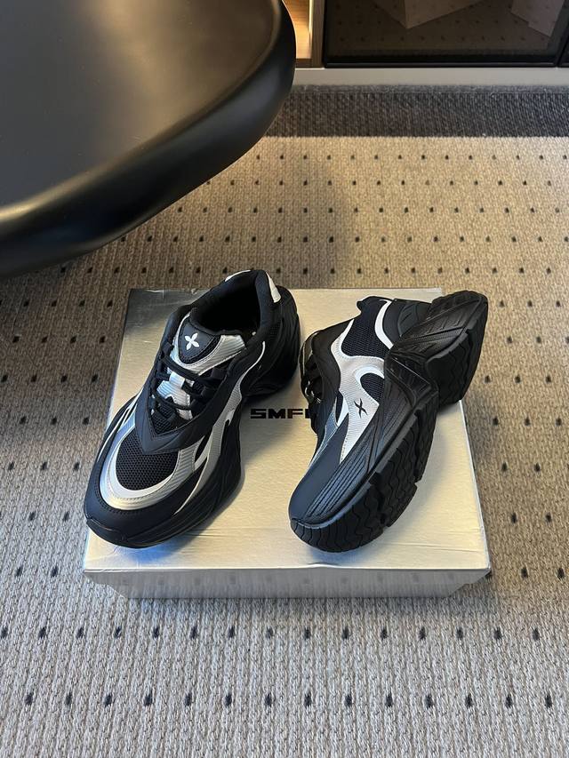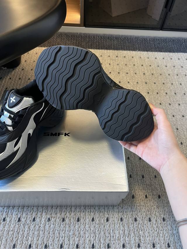 Smfk 25Ss黑色厚底老爹鞋 采用网面与皮革拼接的材质,兼具透气性与质感。鞋身带有品牌标志性的十字花装饰,辨识度高,黑银配色酷感十足,充满未来科技感。 厚底