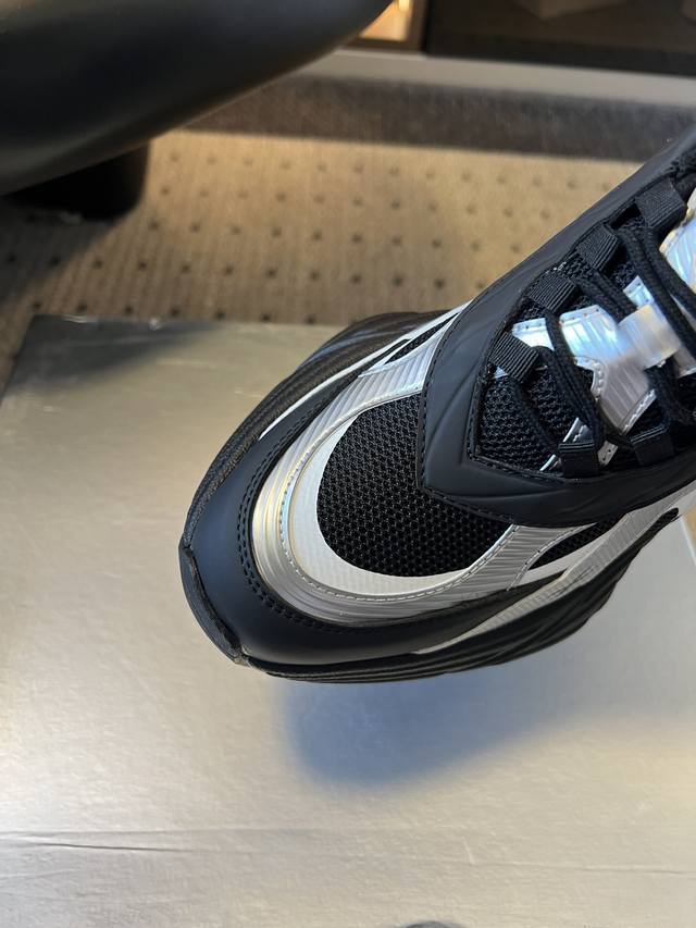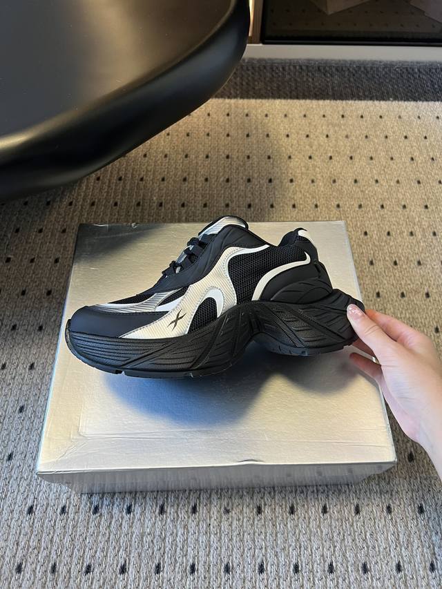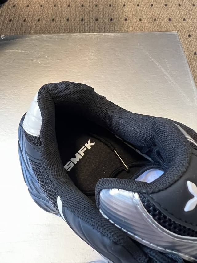 Smfk 25Ss黑色厚底老爹鞋 采用网面与皮革拼接的材质,兼具透气性与质感。鞋身带有品牌标志性的十字花装饰,辨识度高,黑银配色酷感十足,充满未来科技感。 厚底老爹鞋款式,在提升时尚感的同时,还能起到显著的增高效果;系带设计贴合脚型,穿着舒适且便于调节松紧。融合了运动风与潮流感,既适合日常休闲,又能为造型增添个性与前卫感。 鞋面:网面 特殊工艺 内里:弹力网 大底:橡胶组合 Size:35-45 :