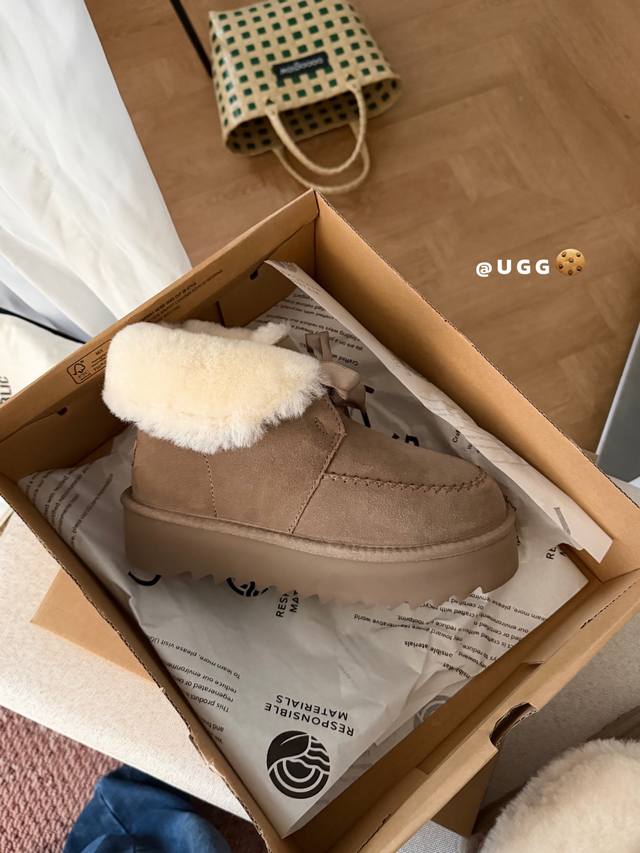 / Ugg|凯琳翻毛皮鞋面可翻折羊毛鞋领 固定蝴蝶结缎带,时尚大方 显得小腿线条又细又长~鞋带也是俏皮可爱,厚底的脚感软乎乎又有增高效果,170即视感了 冬天还没正