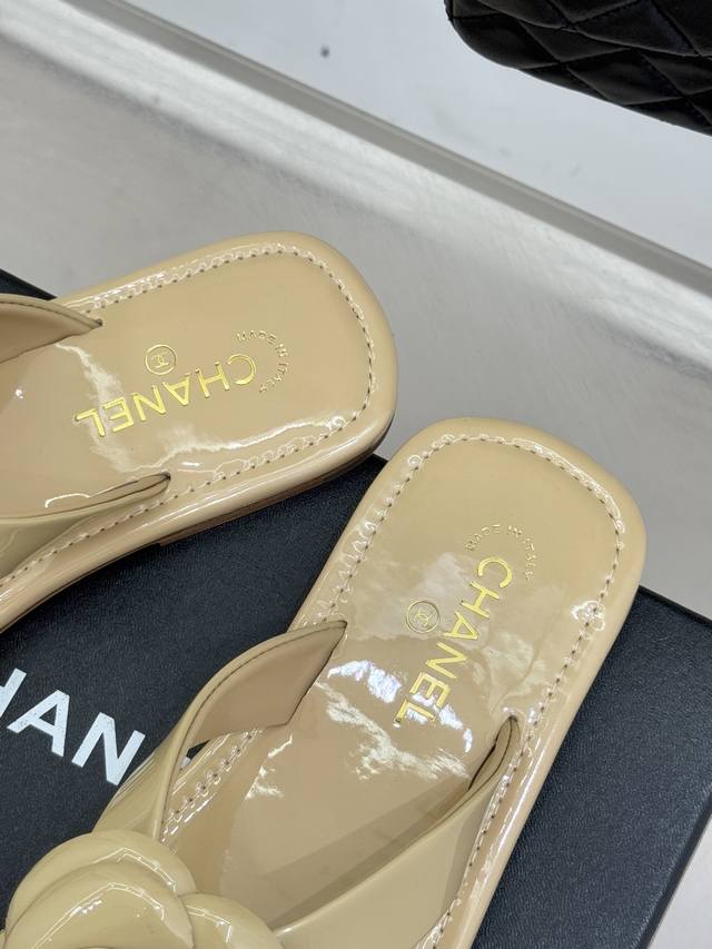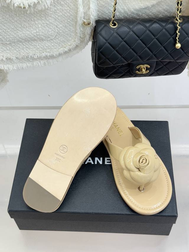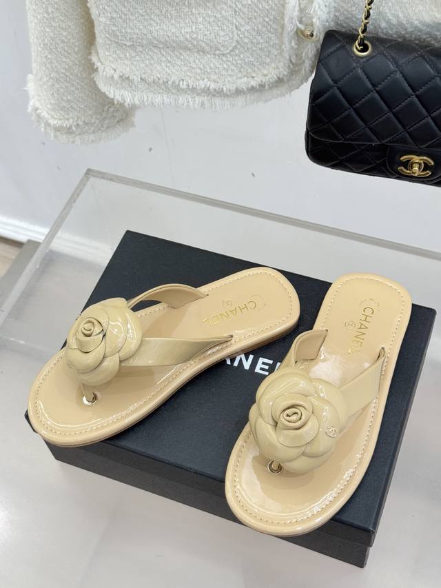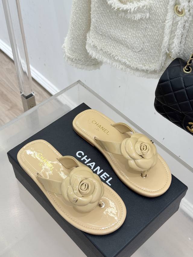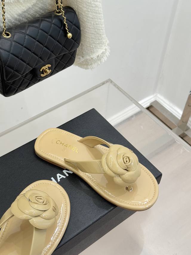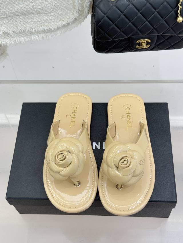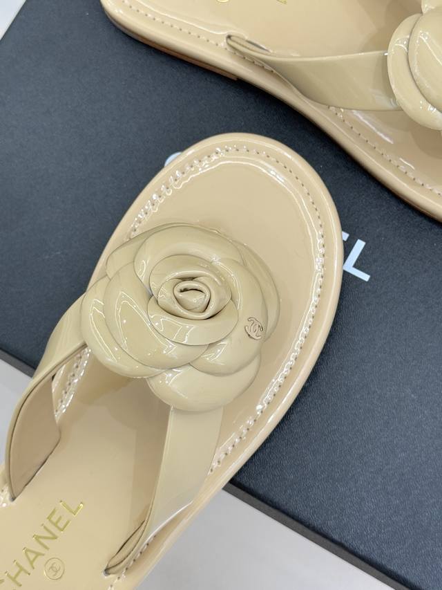 厂价 Chane*|小香 26C早春新品山茶花 夹脚人字拖鞋 将标志性山茶花元素注入慵懒步调 让轻奢质感融入每一段自在行程。 夹趾处缀以立体雕琢山茶花饰件 花瓣