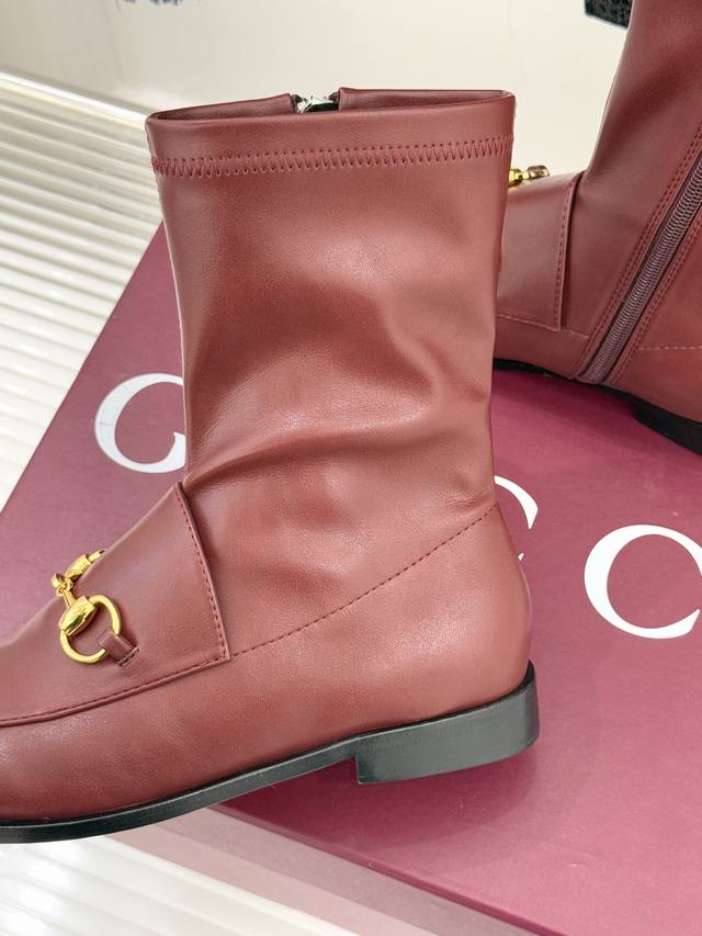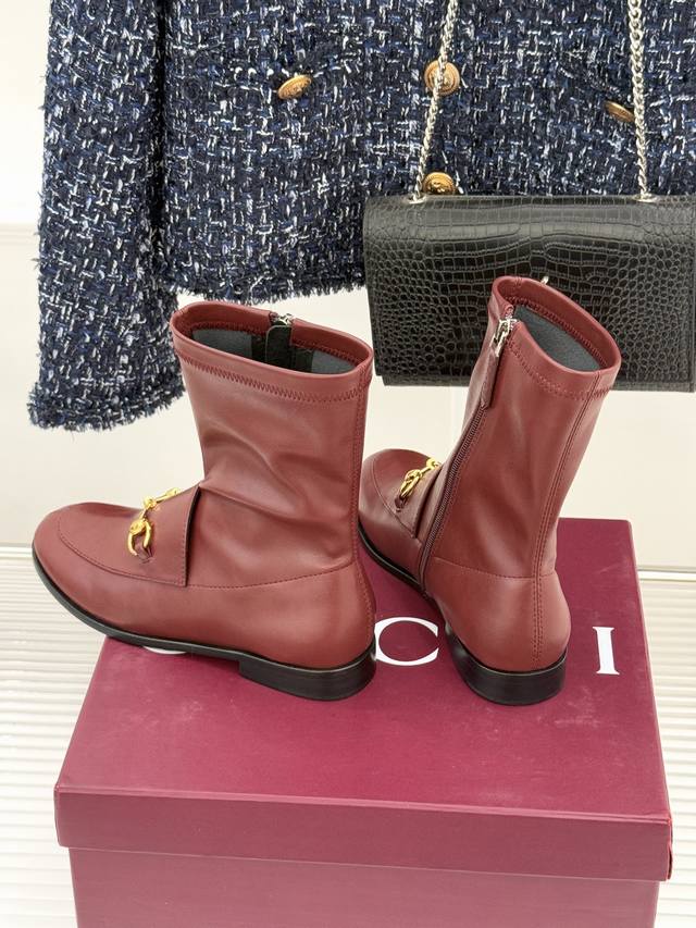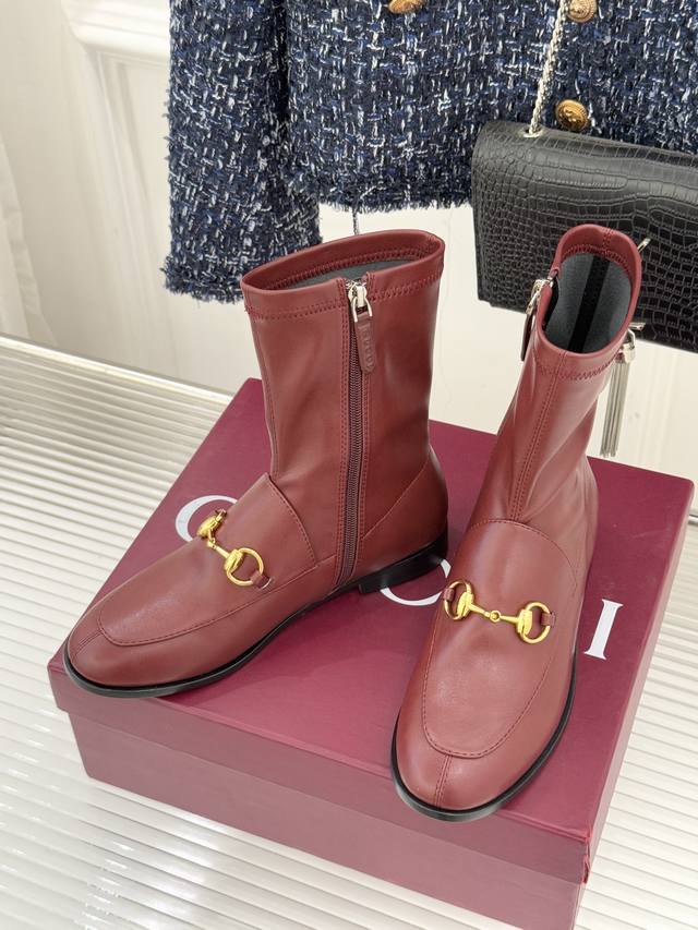 厂价 DDD Gucci 古驰经典双G马衔扣复古乐福 DDD 弹力靴短靴 DDD 当百年马术基因邂逅现代穿着哲学 DDD 这款弹力靴便有了跨越时光的魅力 DDD 标志性马衔扣以浅金色调雕琢 DDD 既是品牌起源的优雅注脚 DDD 也为鞋身注入低调贵气 DDD 呼应着马术运动的经典与力量 。 DDD 鞋面甄选柔韧弹力皮革 DDD 随双足曲线灵活贴合 DDD 靴口的松紧镶饰消解了束缚感 DDD 让穿脱与行走都成为自在享受 。 DDD 延续乐福鞋的复古轮廓 DDD 搭配利落短靴版型 DDD 皮革鞋底承载着意大利