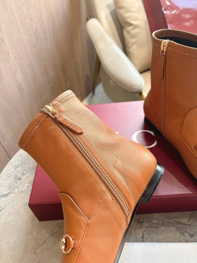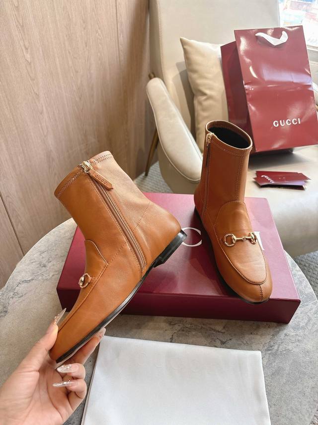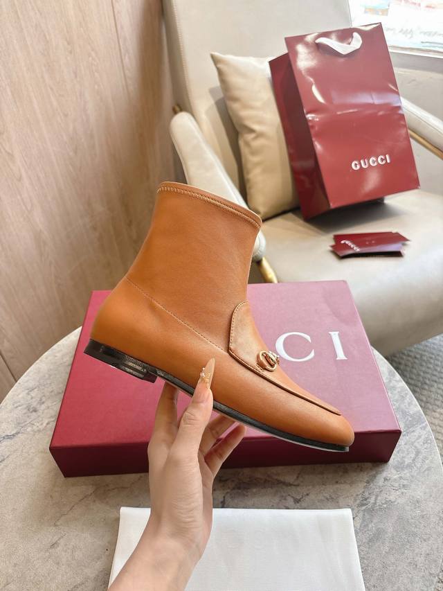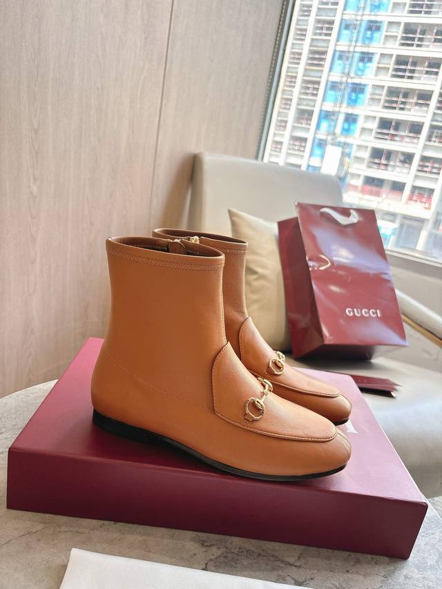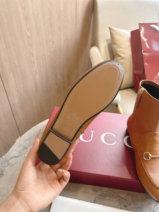 / 920-1 棕¥ 35-42 Gucci Jordaan系列乐福鞋是贯穿四季的经典单品。这款踝靴焕新演绎经典廓形,选用光面皮革,搭配浅金色调马衔扣,彰显别致魅力