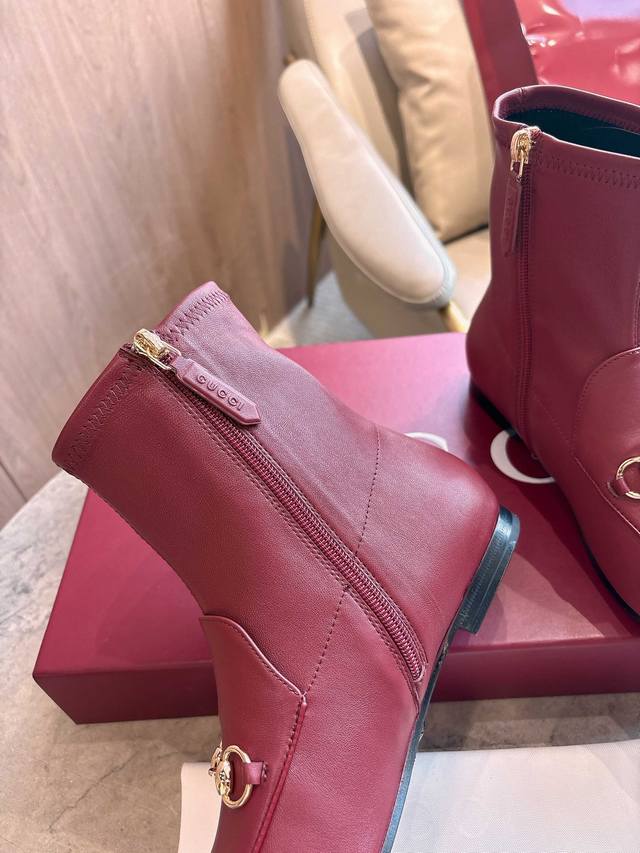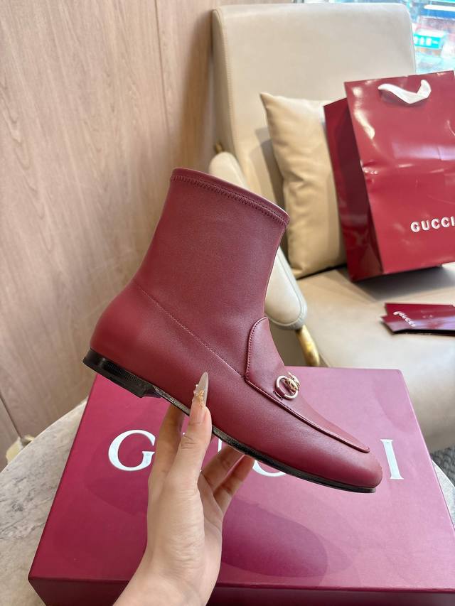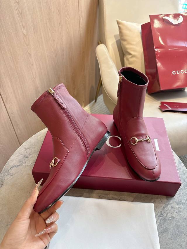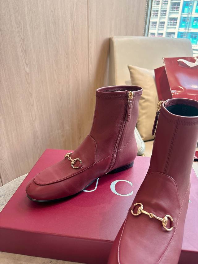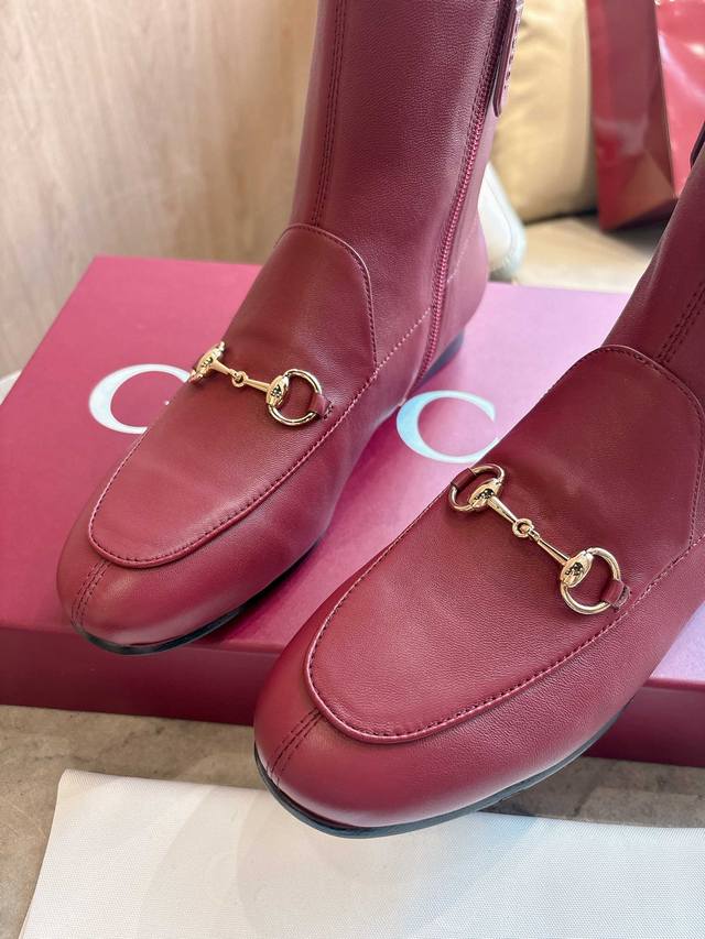 920-1 酒红¥ 35-42 Gucci Jordaan系列乐福鞋是贯穿四季的经典单品。这款踝靴焕新演绎经典廓形,选用光面皮革,搭配浅金色调马衔扣,彰显别致魅