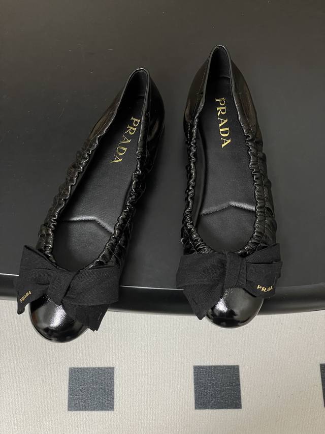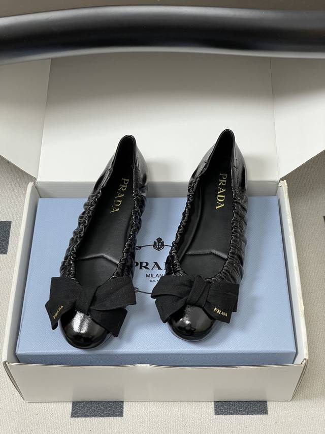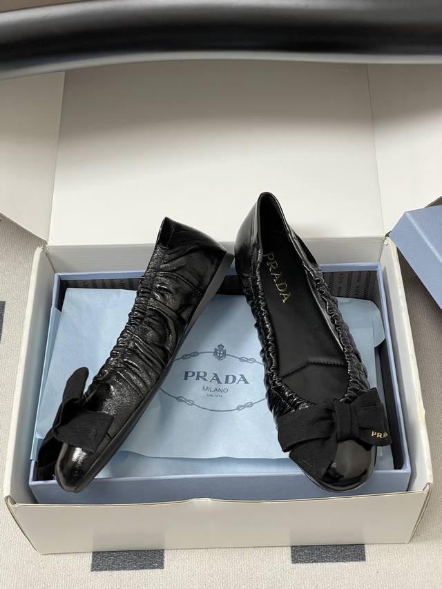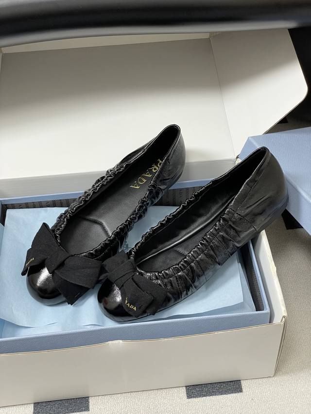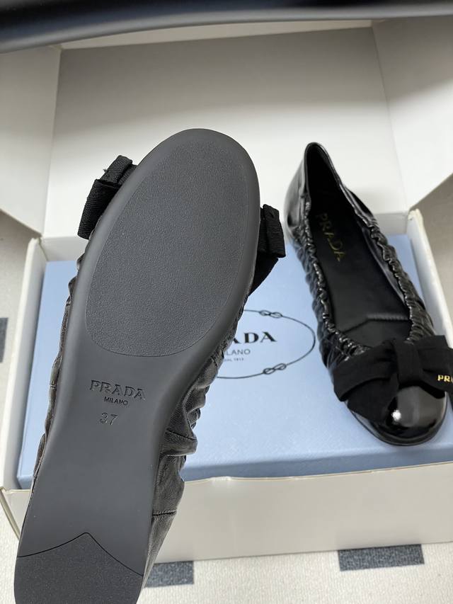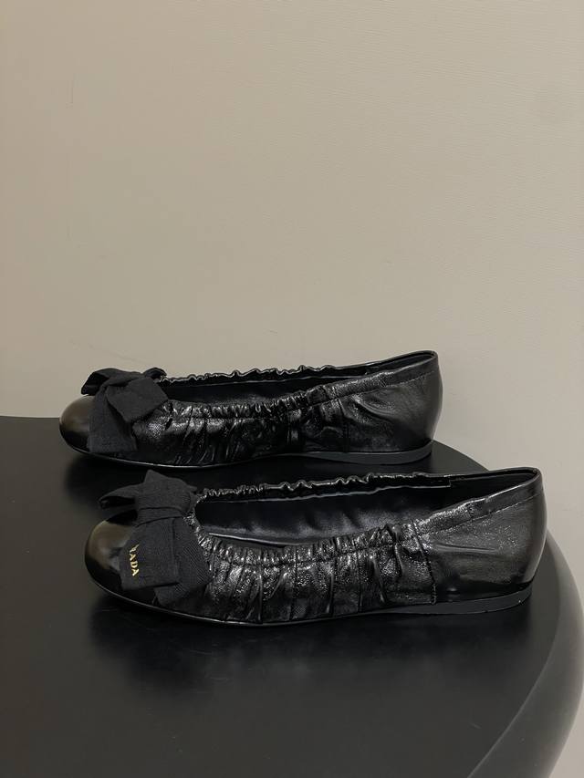 FFF 顶级品质 配高档飞机盒 DDD 26Ss早春新款Prada普拉达 法式大蝴蝶结芭蕾舞鞋褶皱玛丽珍单鞋超软超舒服平底船鞋 DDD 这款蝴蝶结芭蕾舞鞋,柔软细腻,黑色蝴蝶结点缀,法式优雅复古感满满。鞋型贴合脚部,松紧口设计,穿着舒适不勒脚,适合长时间行走。金色光泽在光线下超吸睛,无论裙装还是裤装都能轻松驾驭,日常或正式场合都很出彩。鞋底轻便,兼具美观与实用,是芭蕾舞鞋爱好者的理想选择!鞋面的褶皱设计很软乎,踩上去像踩在云朵上,暴走一天也不累脚,配裤子慵懒松弛,配裙子又成了甜系公主,一鞋多搭太香了~ D