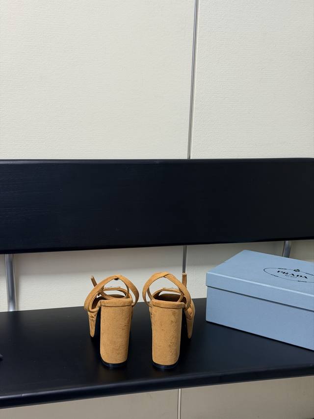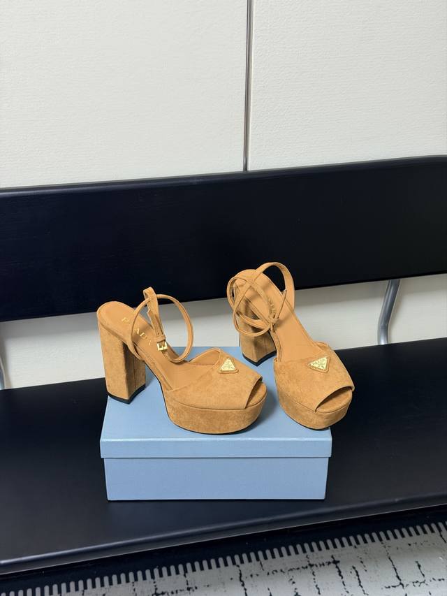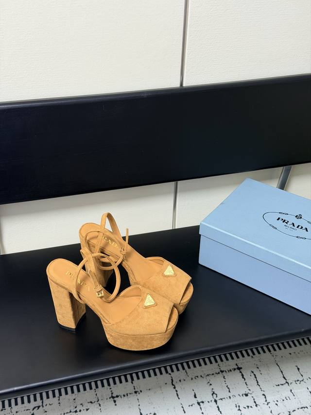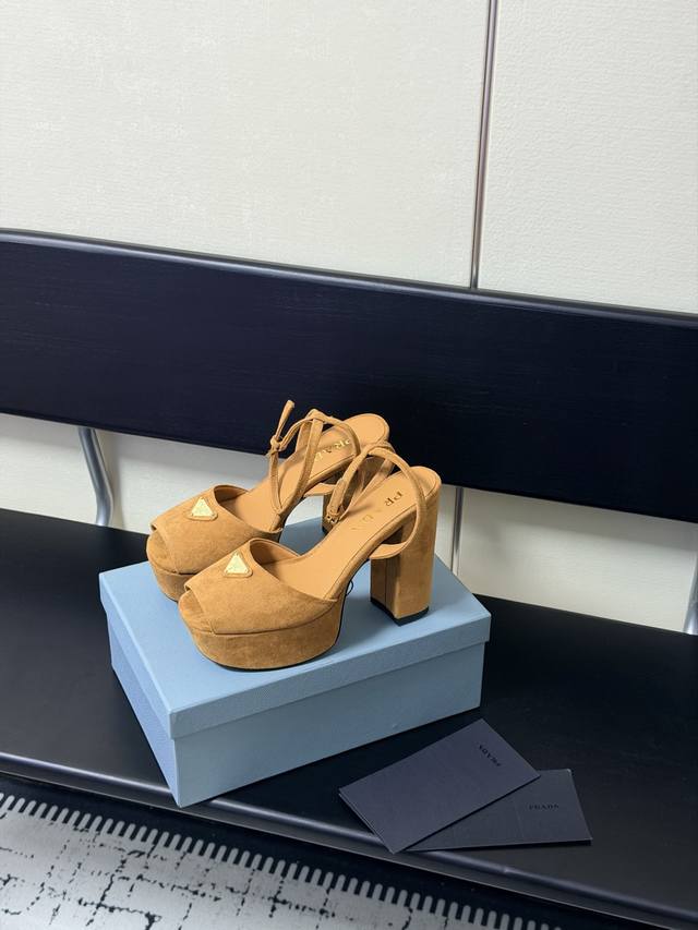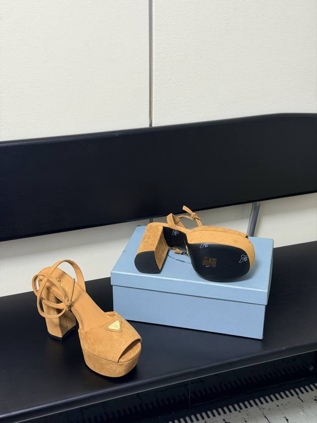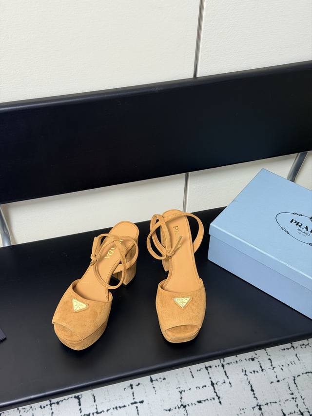 FFF 2026春款新款 Prada 普拉达 三角标Vs丝印Lg防水台厚底粗跟凉鞋。舒适度与时髦度并存,每个颜色搭配都好看,设计搭配不同风格需求水台加跟轻松驾驭。鞋面采用进口羊皮Vs羊京绒,内里垫脚为进口羊皮,意大利真皮大底。水台高:4.5Cm,跟高:11.5Cm。Size:35-40 DDD