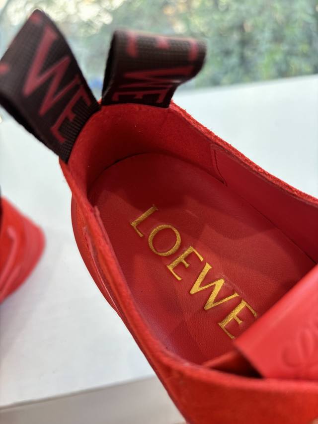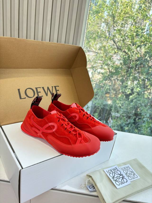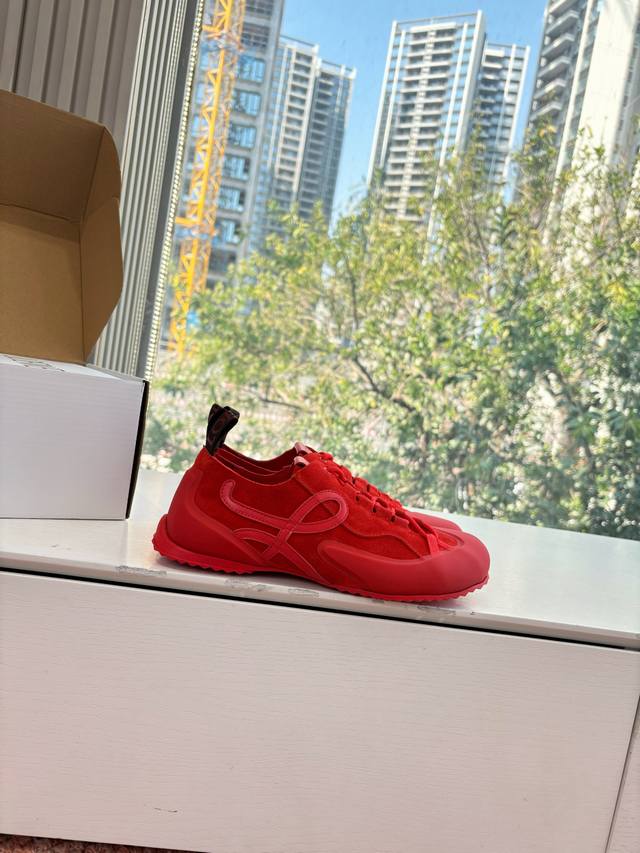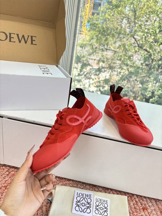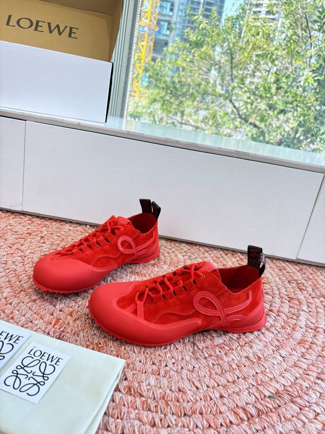 FFF G209所见即所得Loew *罗意威2026新款 新色上新活力满满芭蕾阿甘鞋 DDD 其设计灵感源于上世纪七八十年代的经典跑步鞋,保留了流畅的楔形轮廓和齿状花纹鞋底,奠定了复古运动的基调。Loewe通过极致的圆润化与膨胀感处理,为这款复古鞋注入了未来主义色彩。鞋身如同被充入空气,显得格外饱满、柔软,消除了传统复古跑鞋的“扁平”与“硬朗”,从而获得了“芭蕾舞鞋”般的轻盈与蓬松视觉感受。 DDD 艺术化调色盘,Loewe的调色始终充满艺术气息。低饱和度柔和色系灰蒙绿,延续了品牌的“静奢”格调,高级且易