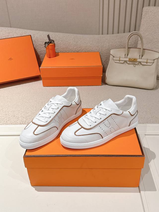 FFF Hermes 顶级版本# DDD 26Ss休闲运动鞋 山羊皮小牛皮运动鞋,饰有镂空“斜体H”图案,设计简约流畅,打复古都市造型。配送专柜精美包装 DDD 面料:山羊皮+小牛皮 DDD 内里:混种羊里 DDD 大底:原版Tpu DDD 底厚:2Cm DDD 码数:35-45 女41 男45订做 DDD