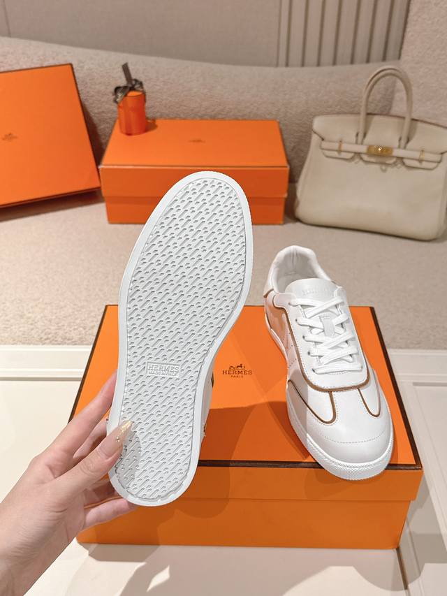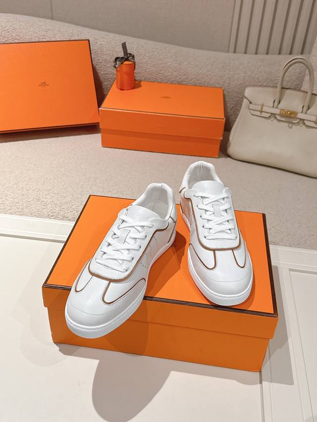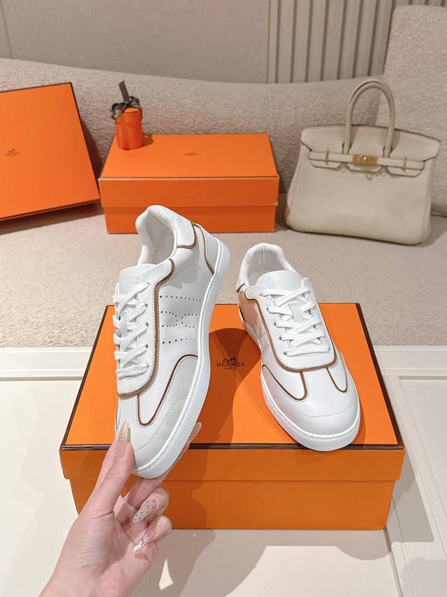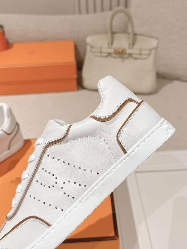 Hermes 顶级版本# DDD 26Ss休闲运动鞋 山羊皮小牛皮运动鞋,饰有镂空“斜体H”图案,设计简约流畅,打复古都市造型。配送专柜精美包装 DDD 面料: