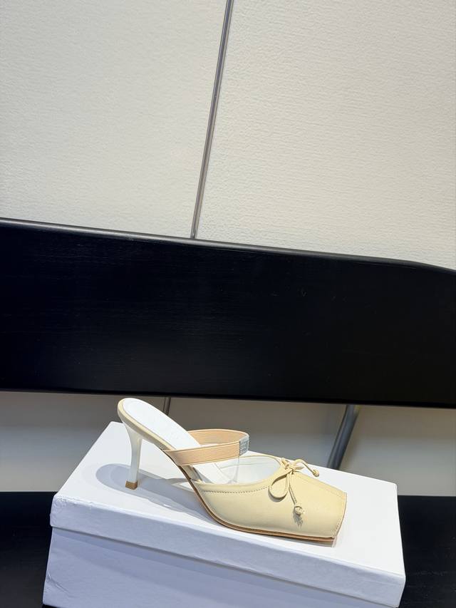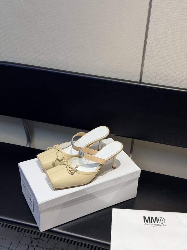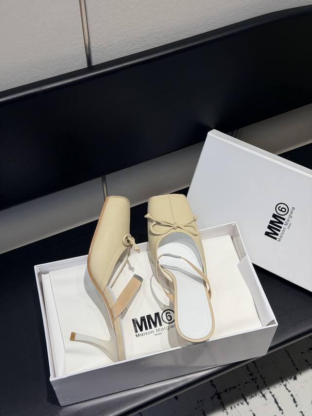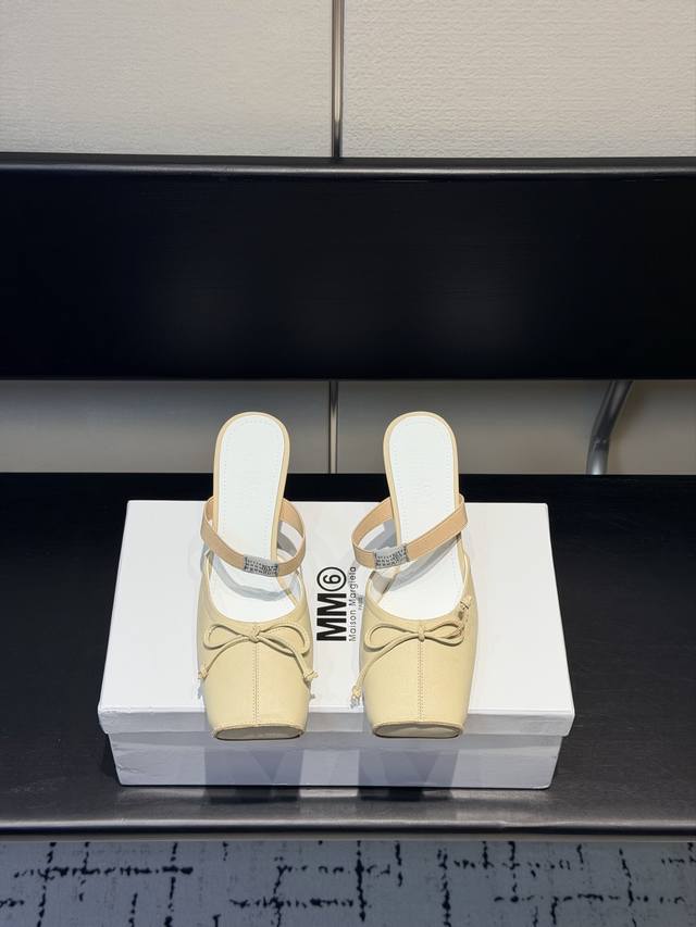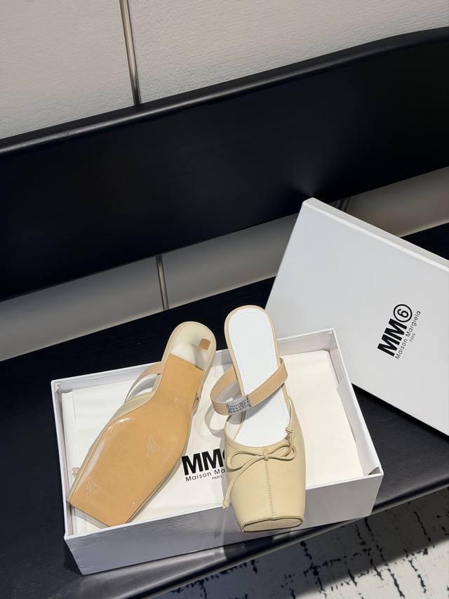 FFF Mm6、 26春夏款复古方头弹力带芭蕾鞋高跟鞋凉鞋系列 DDD 采用品牌标志性的贴合脚型的雕塑感轮廓,鞋面柔软且线条流畅,兼顾贴合度与设计感。方头+芭蕾元素融合:经典方头设计打造现代感,搭配鞋面蝴蝶结装饰,重构芭蕾鞋的优雅轮廓,同时做穆勒拖的后空款式,兼具休闲与精致。 DDD 鞋后跟处有标志性的白色单线缝线,鞋身弹性带带有Mm6数字标识,是品牌辨识度的关键。后空的穆勒拖结构,简化穿脱方式,将芭蕾鞋的柔美与穆勒鞋的随性结合。 DDD 鞋面:复古爆裂牛皮 DDD 内里:丝绸羊皮里 DDD 大底:真皮大