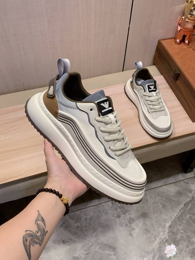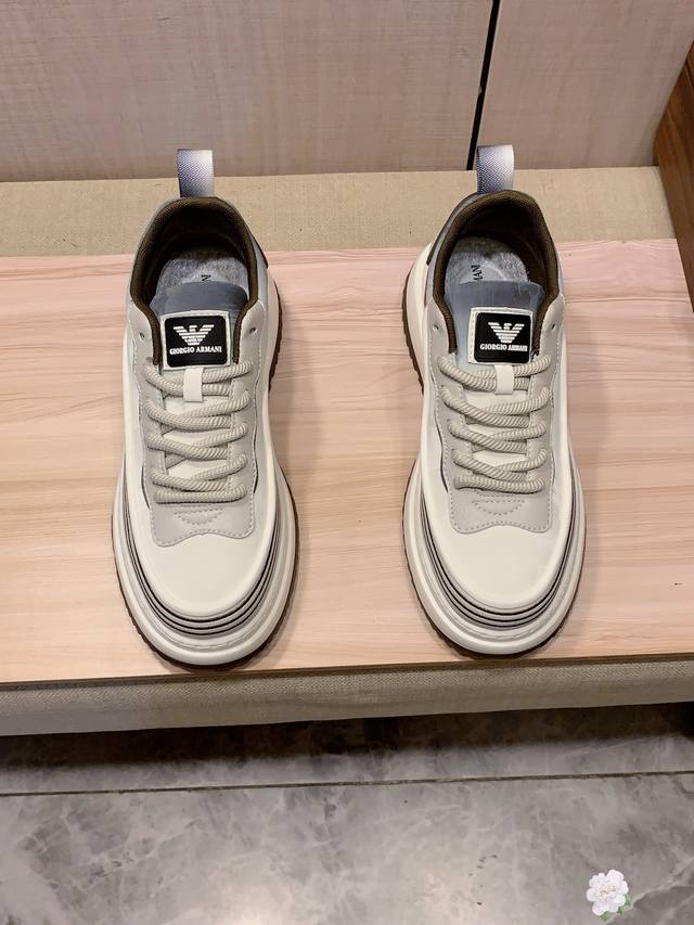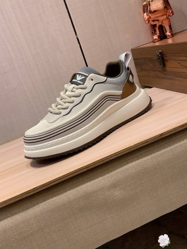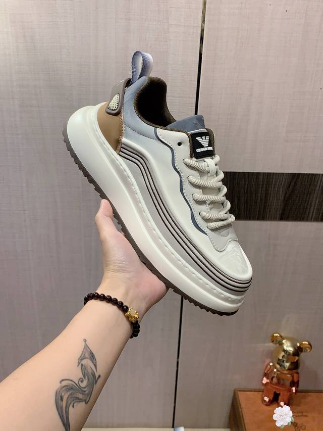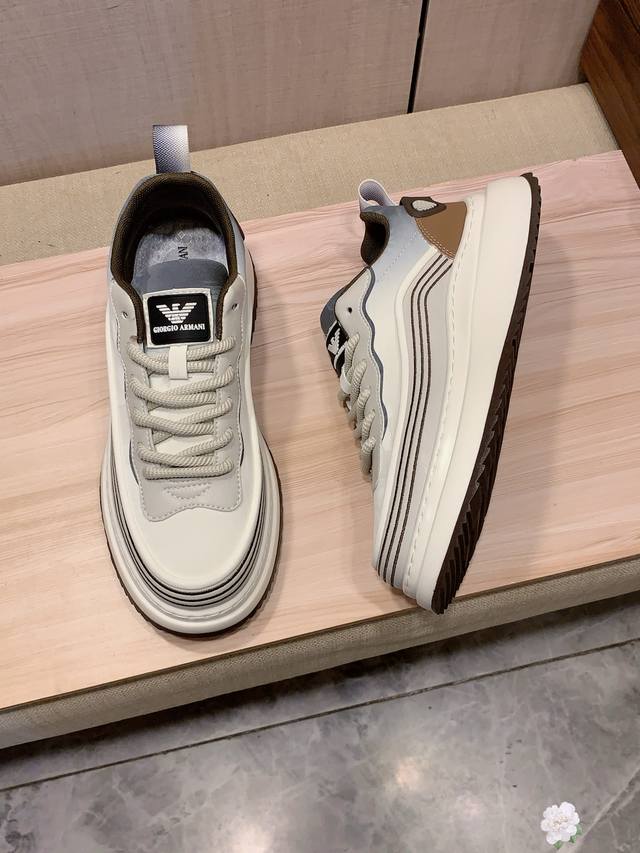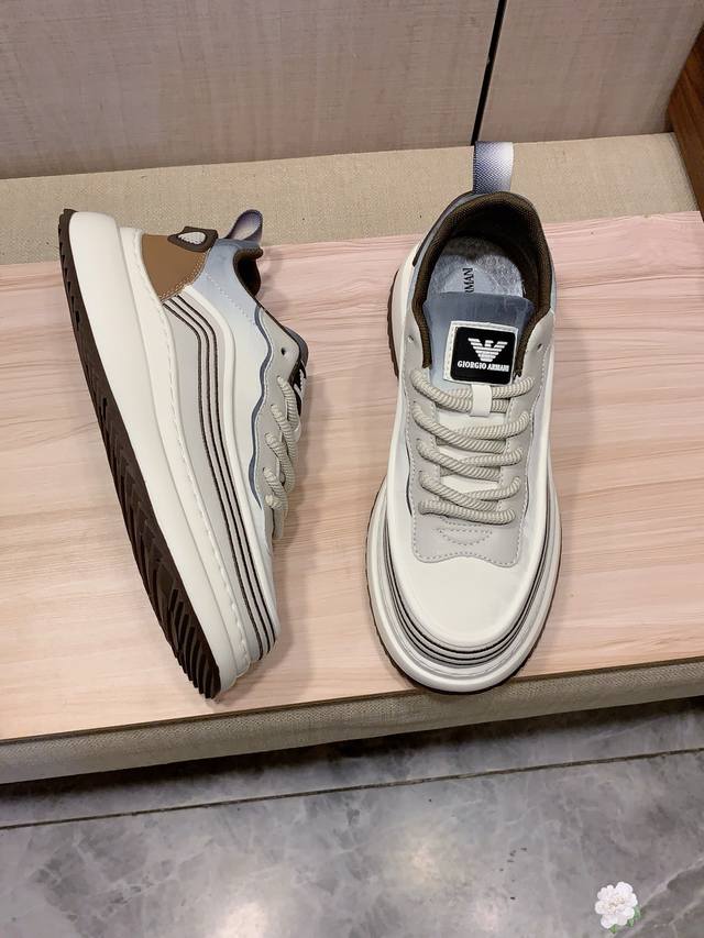 新款: 厂价 阿玛尼* 最新爆款休闲鞋,顶端品牌 奢侈~代购,顶级~质量。 鞋面選用进口透气牛皮搭配材质透气羊皮垫脚 精细做工。原版个性时尚柔软橡膠耐磨防滑大底,上脚轻巧舒适,实物拍摄實物更好看,004:码: 38-44,2色入选