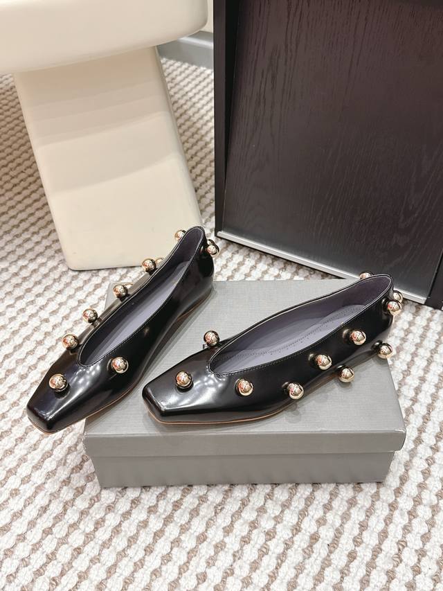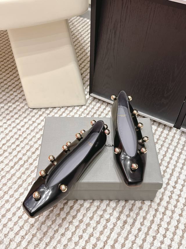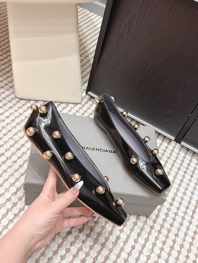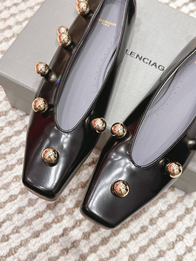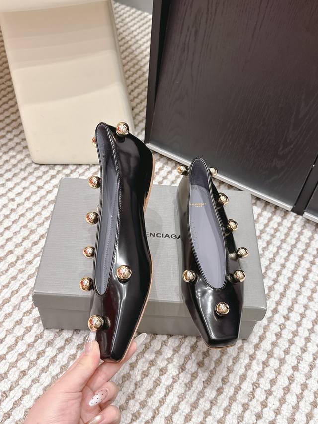 代购级 Balenciaga金属装饰 漆皮 平底鞋 单鞋 巴黎世家2026早春新款,方头设计+金属球装饰,时髦又有辨识度!漆皮材质光泽感满分,黑色、白色、裸色可