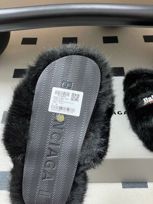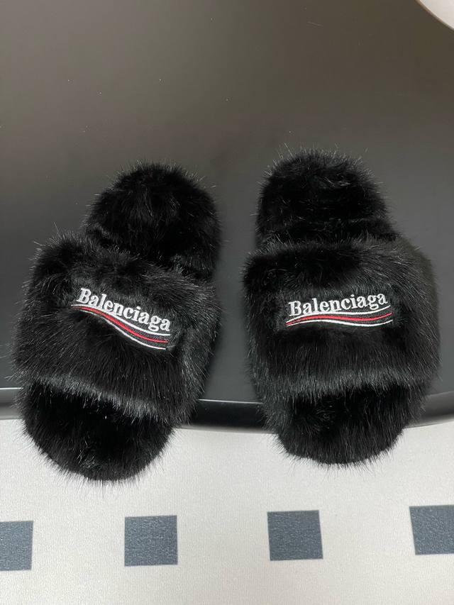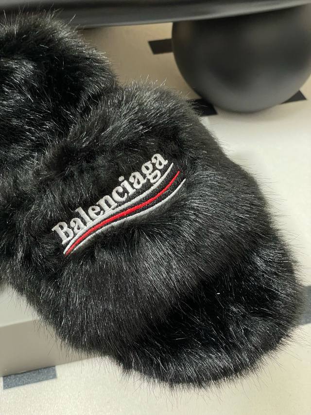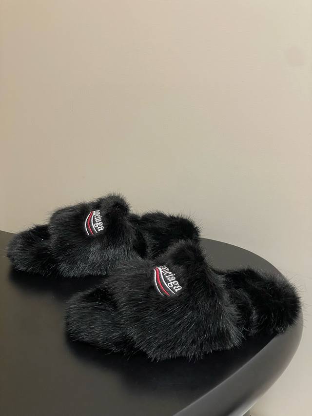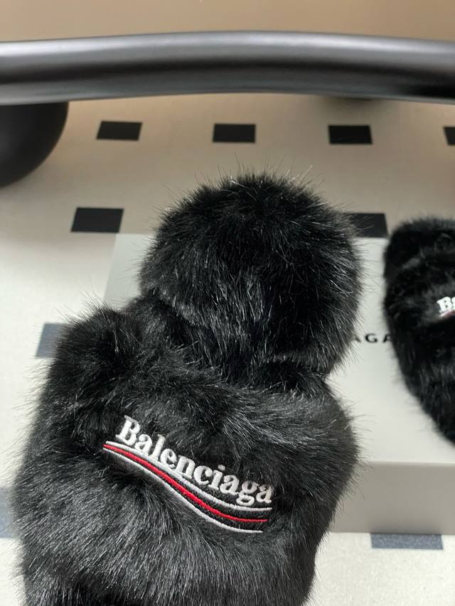 出厂 25S秋冬新款Balenciaga巴黎世家最新字母刺绣毛毛鞋厚底兔毛拖鞋 时尚的毛拖鞋怎能不爱呢!符合当下流行的慵懒风,行走间更显自在随性。 鞋面上有经典