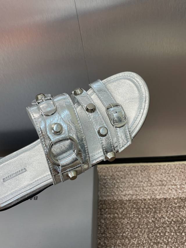 balenciaga 2025专柜春夏新款平底圆头朋克风格金属皮带扣女鞋 巴黎世家字母Logo五金扣鱼嘴露趾凉拖鞋