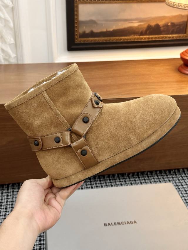 巴黎世家新款雪地靴 25Ss 新款添加了金属铆钉元素超级朋克街头简直太别致了 Ins爆款 原版购入开模全手工锁金属铆钉打造 所有的材质与工艺原版一致 质感满满 鞋面材质:原版翻毛牛皮 鞋底材质:牛皮包边大底 可选码数:35-90 原版包装