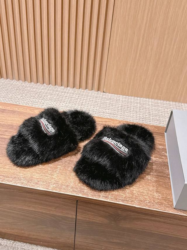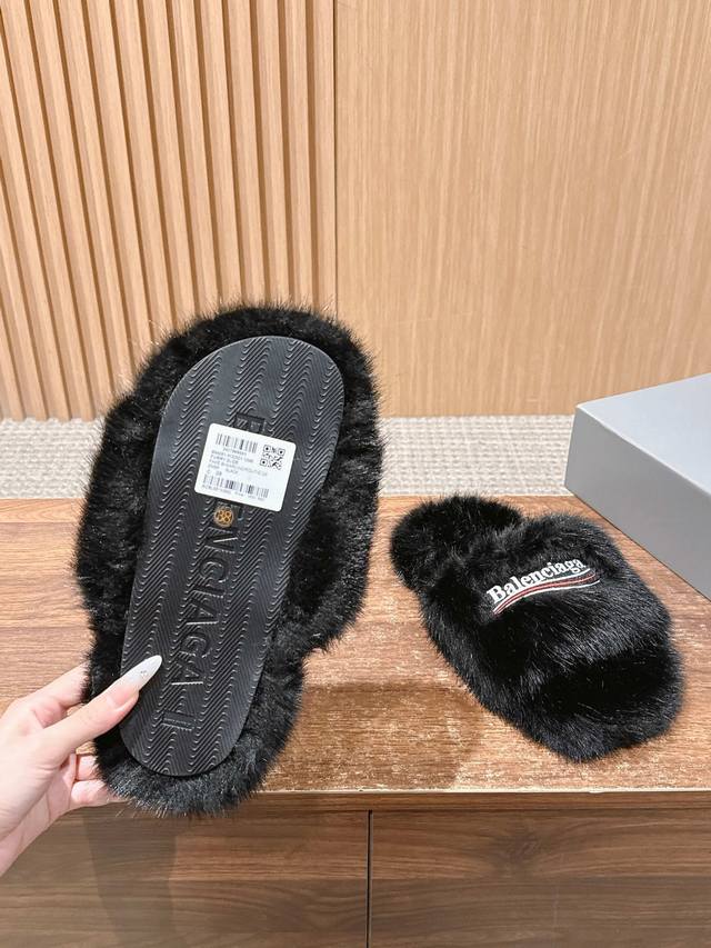 巴黎世家秋冬潮品羊毛拖鞋 徽标刺绣! 欧美名媛 明星 网红Girl 大爱款 精致鞋面手工缝纫走线 蓬松柔软 亲肤柔软冬季必备款 时尚却不过分张扬 原版天然橡胶防