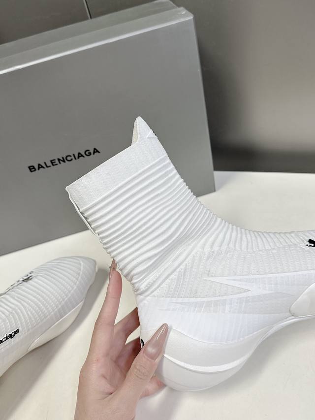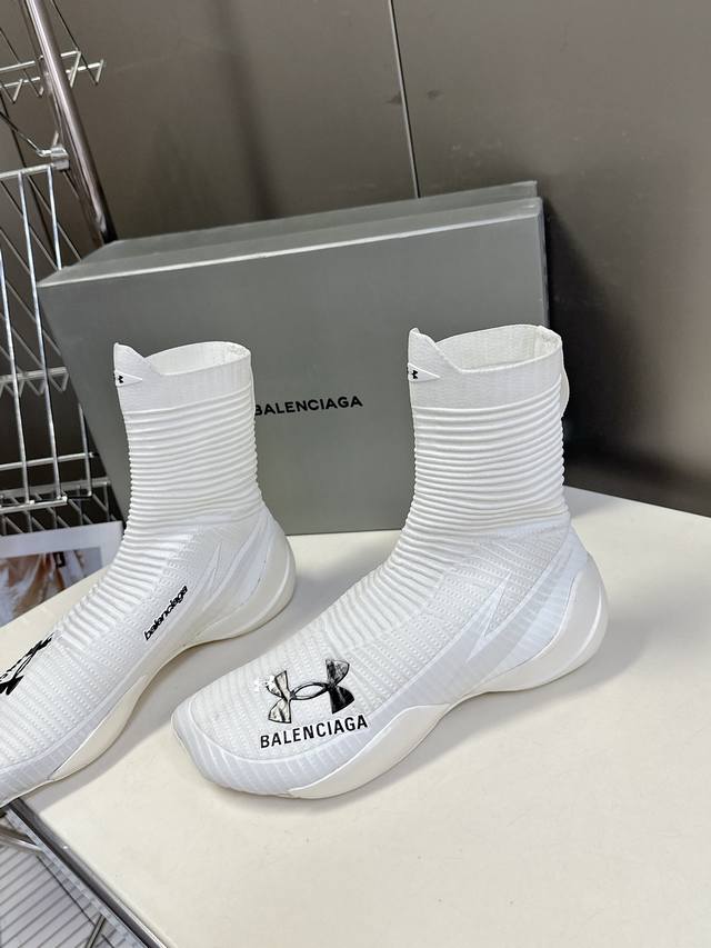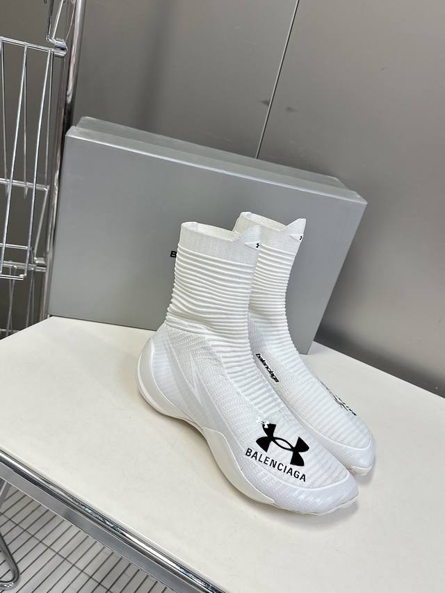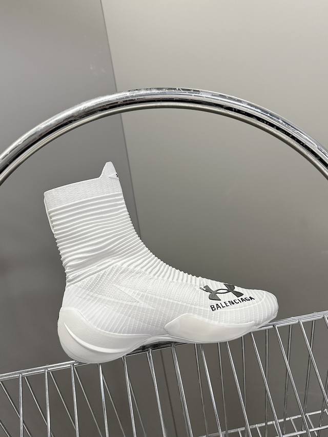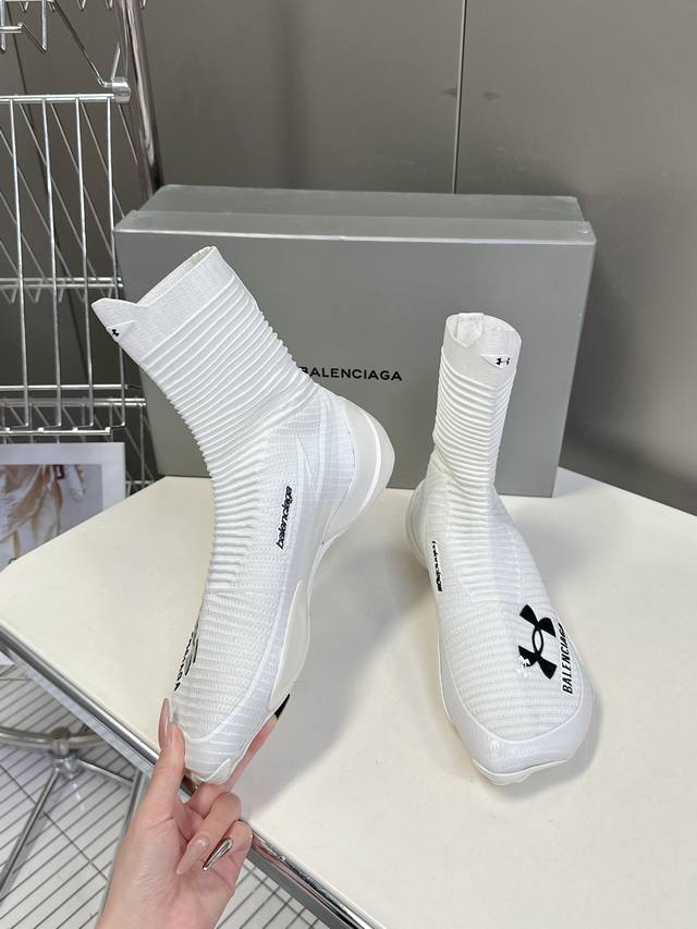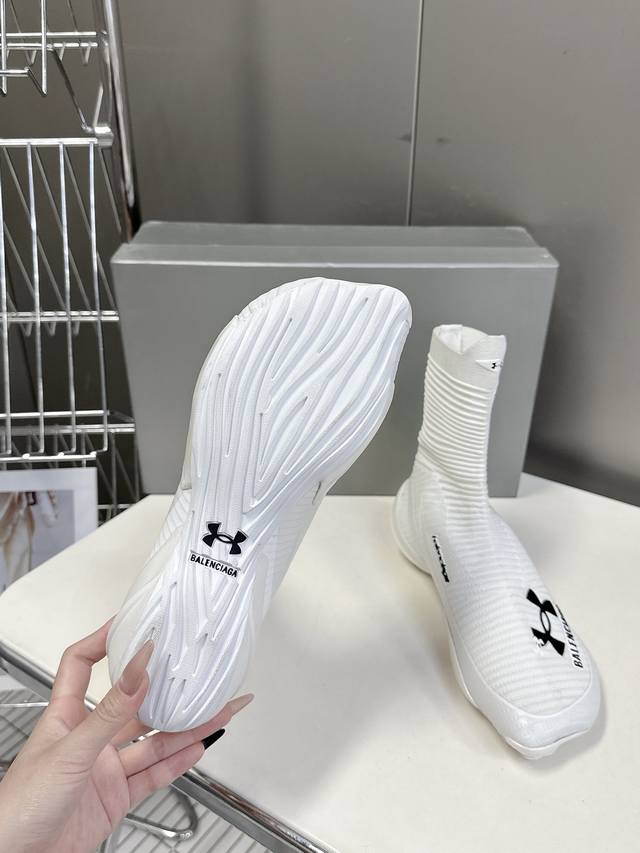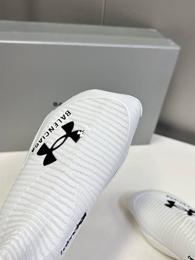 巴黎世家Balenciaga春夏秀款安德玛联名情侣款袜子鞋 专柜10310Rmb购入开发 Balenciaga和Under Armour胶囊系列是一个高端奢侈品牌与运动品牌的大胆合作。这个系列包括了超大号的连帽衫、短裤和现代配饰,体现了高级时尚与运动装的融合。Balenciaga以其前卫的方法而闻名,而Under Armour则以其性能装备而知名,两者创造了既适合街头时尚爱好者又适合高级时尚爱好者的单品。合作系列采用了极简设计,带有双品牌标识,展示了Balenciaga的奢华与Under Armour的运