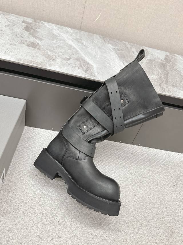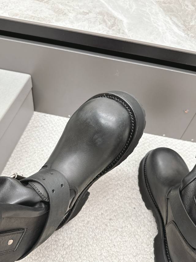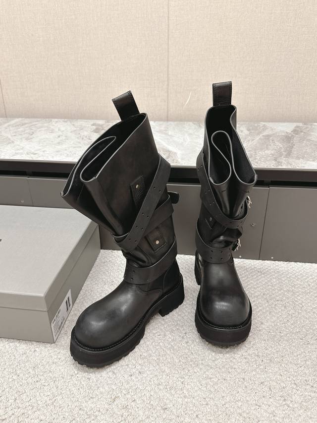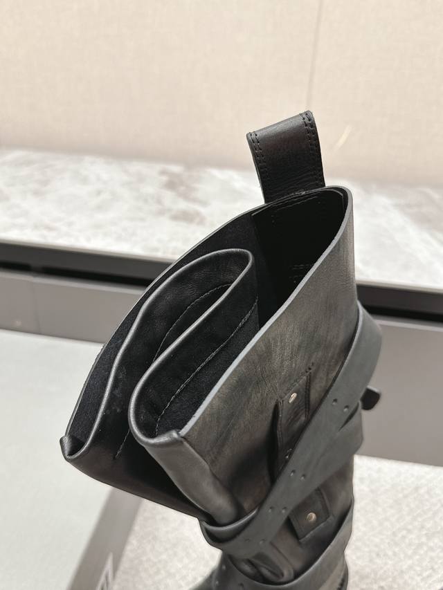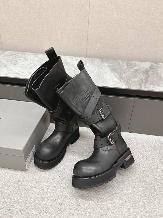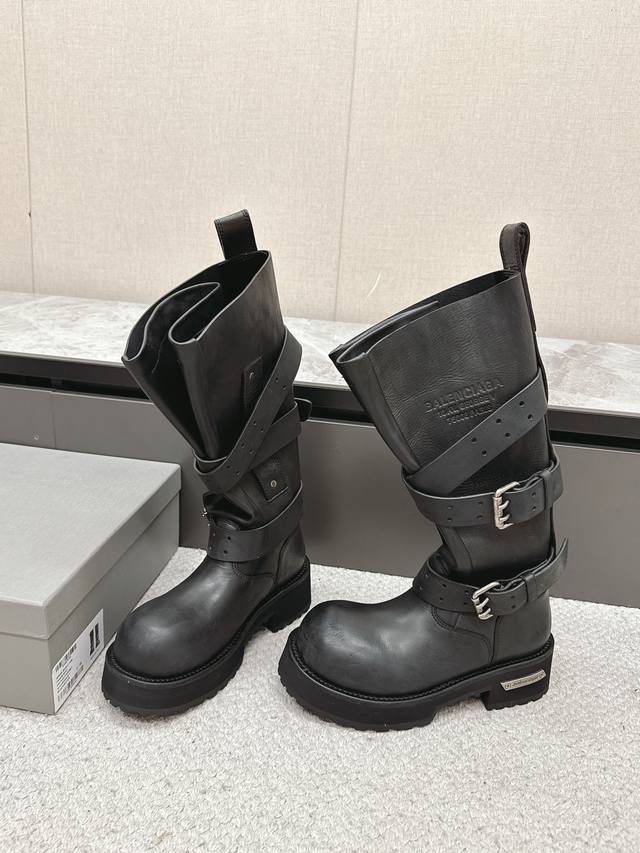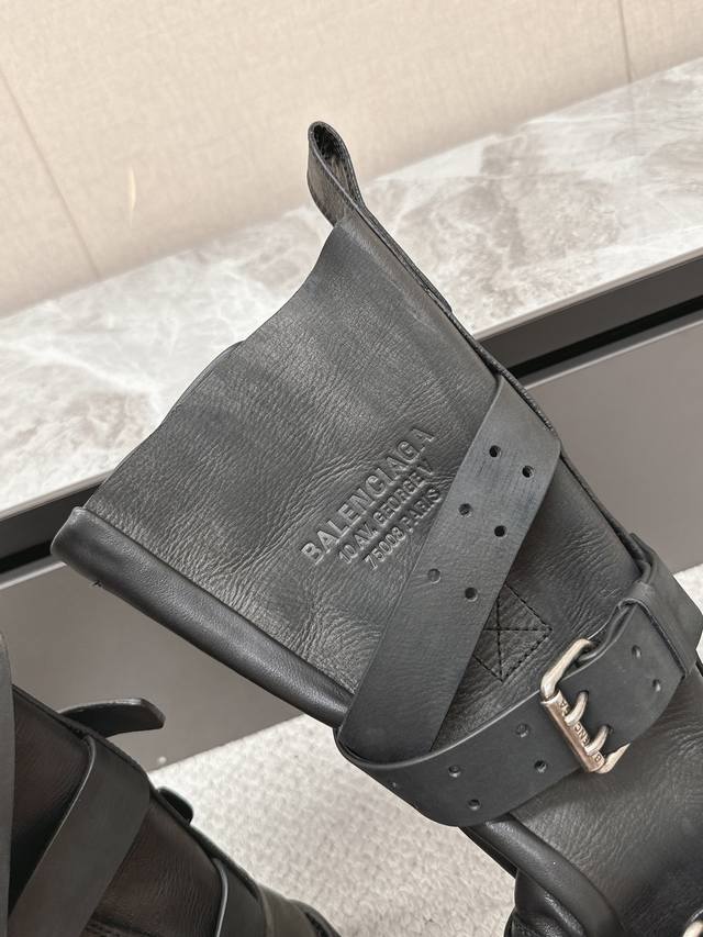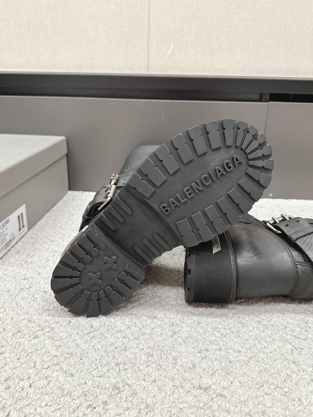 男20 Balenciaga巴黎世家25Fw毒液Venom情侣款高筒靴 中筒靴 请认准高版本 这款靴子在设计上独具匠心 以绑带与皮带元素作为亮点 不仅能将靴子稳固贴合于足部 更可随心调节松紧 在细节处理上 品牌标志性的做旧五金件贯穿始终 巧妙营造出复古磨损效果,彰显个性态度搭配厚实的齿状橡胶鞋底 既保证了穿着的舒适度,又强化了整体的时尚感与辦识度Venom高筒靴无疑是本季不容错过的时尚单品,它将为时尚爱好者们的穿搭增添别样魅力,引领新一轮的潮流风尚 靴筒高度370Mm 鞋面头层牛皮做旧处理 内里水染牛皮