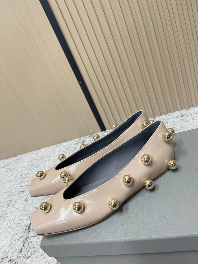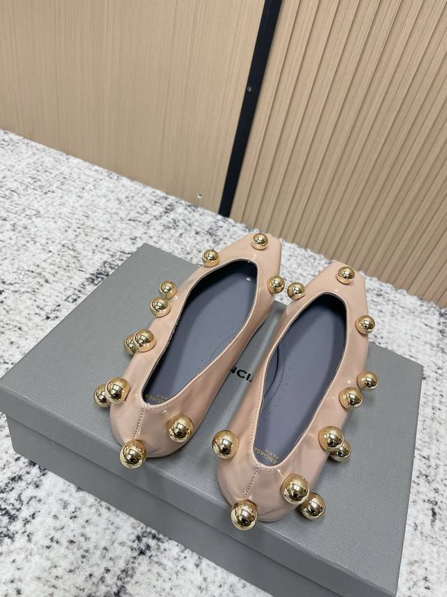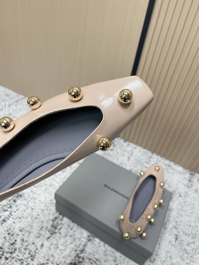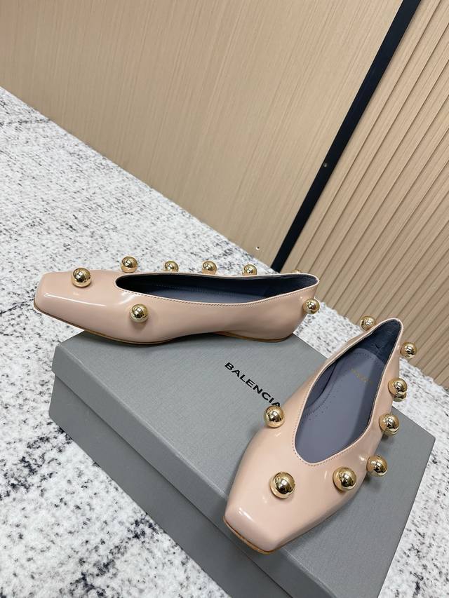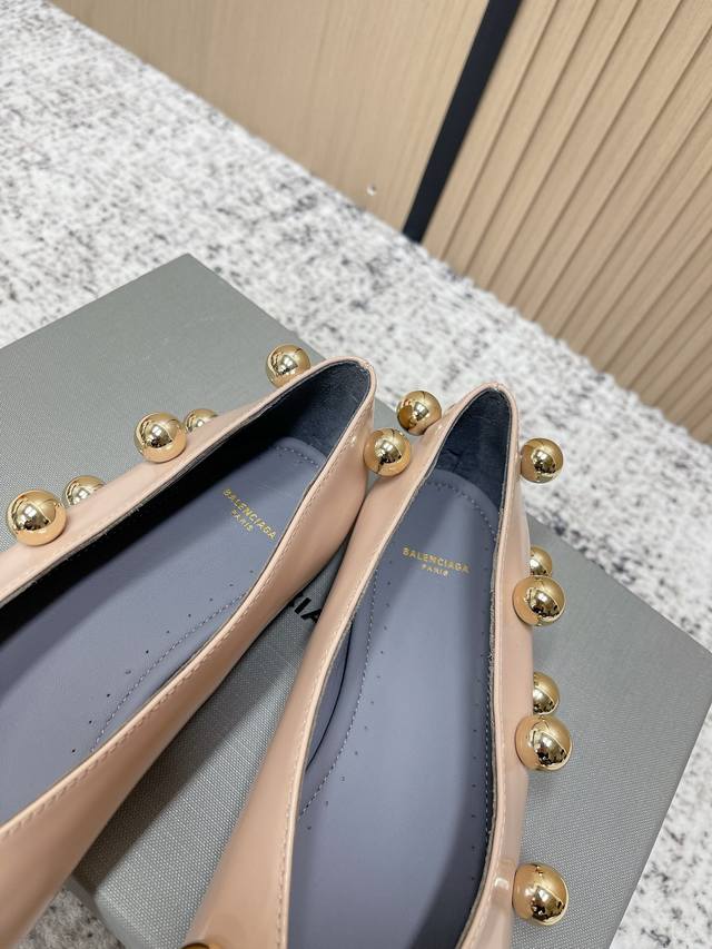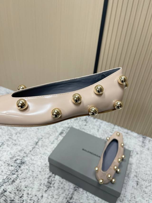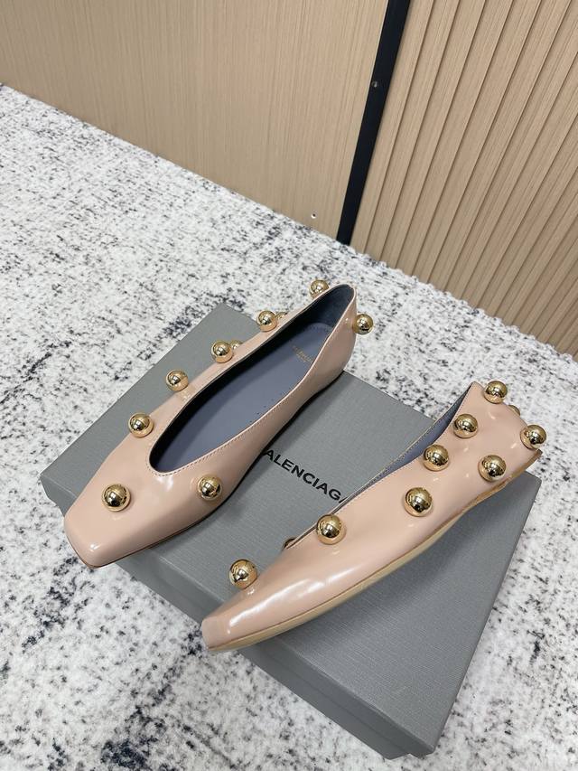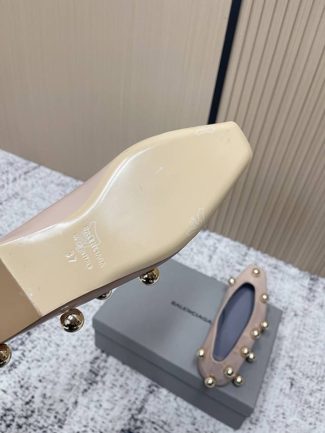 FFF 顶级版本: DDD Balenciaga巴黎世家 26 金属圆珠极简平底鞋单鞋 DDD 采用锐利方头的极简平底鞋型,鞋身线条流畅利落,是巴黎世家标志性的先锋简约风格,平底设计兼顾日常穿着的舒适度。 DDD 鞋身两侧及鞋头点缀金属圆珠铆钉,金色金属装饰与皮革形成材质对比,成为视觉焦点,增添了酷感与精致度。选用亮面漆皮材质,呈现裸粉、米白、黑色三种经典配色,漆皮的光泽感提升了鞋款的质感,配色也适配多种穿搭场景。 DDD 鞋面:开标珠牛皮 DDD 内里:羊皮 DDD 大底:真皮大底 DDD Size:#