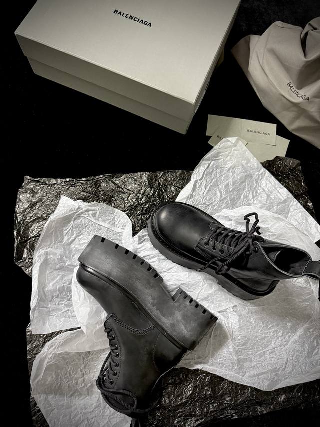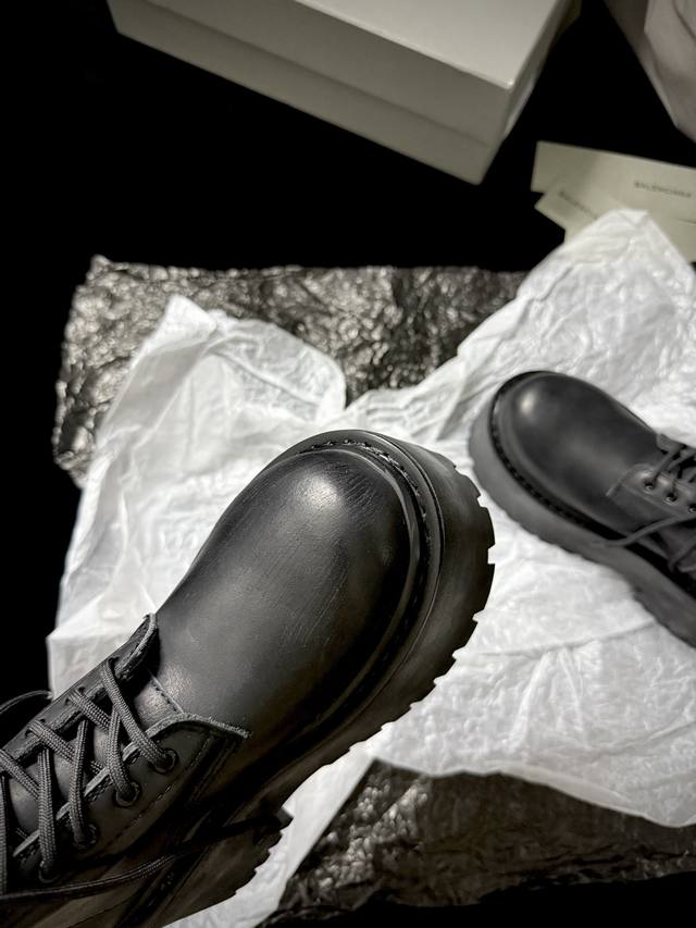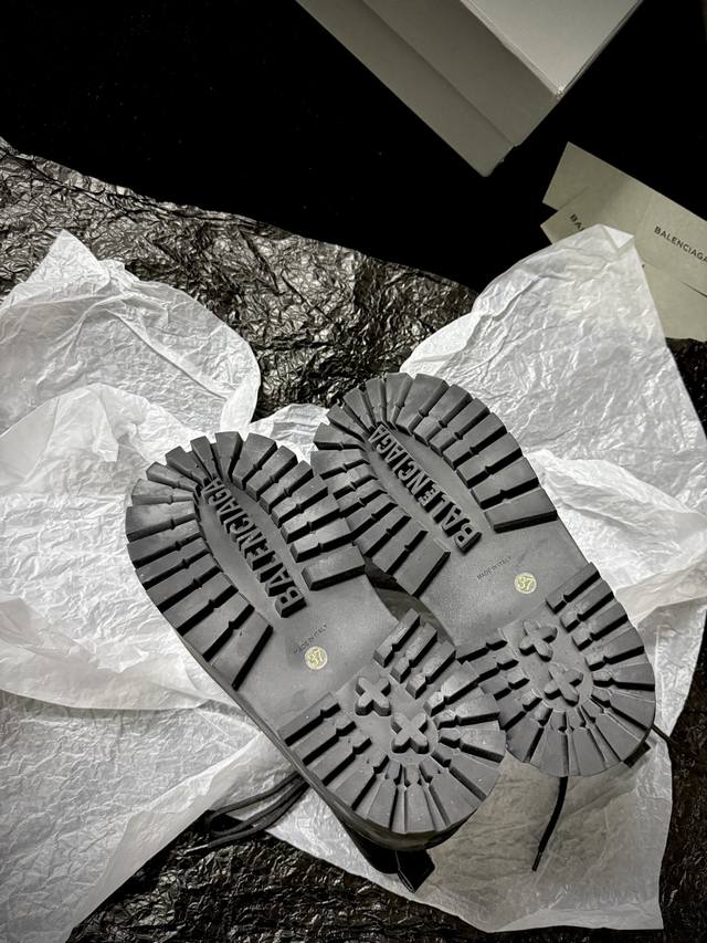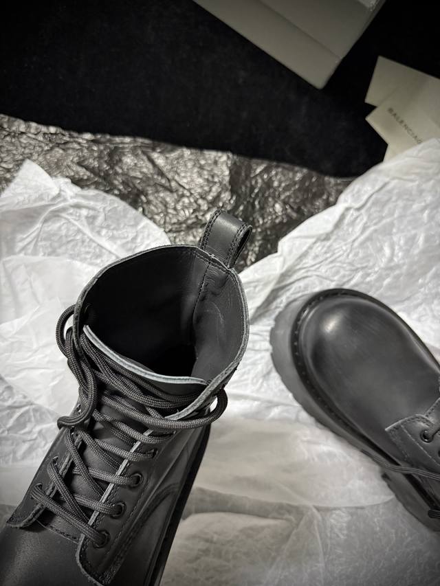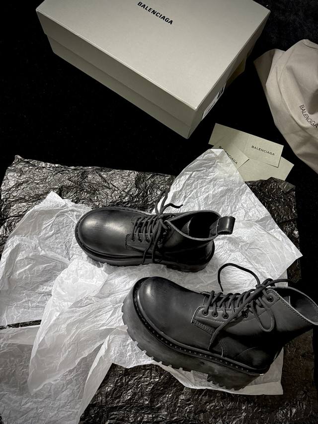 Balenciag* 新品 厚底马丁靴 简直是酷感时髦的代名词 质感十足的黑色皮革 彰显不羁态度 极具个性的厚底设计 不仅增高 还让每一步都踏出强大气场 鞋面进