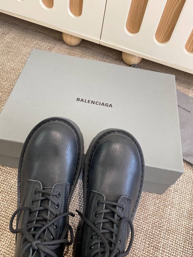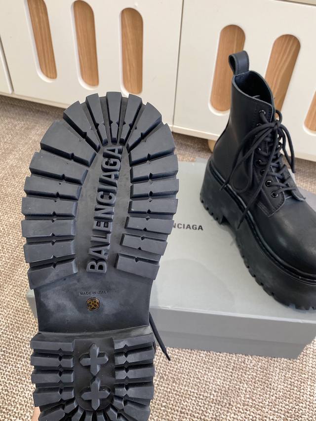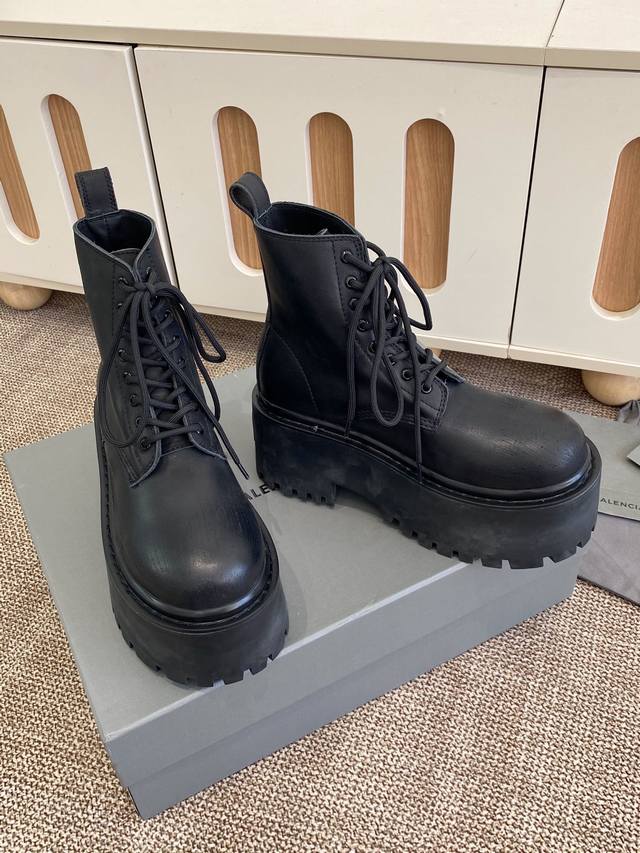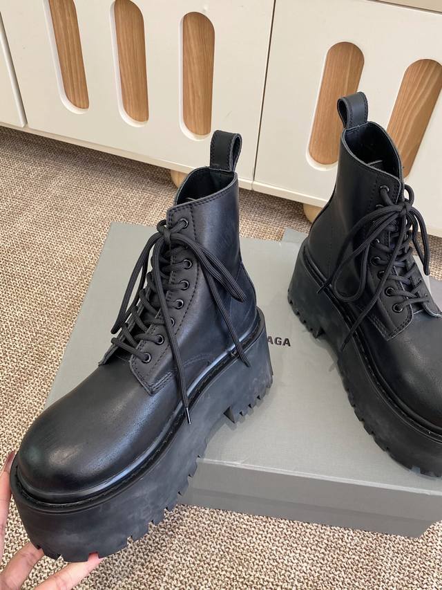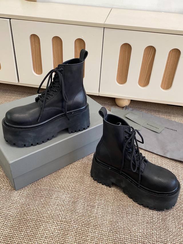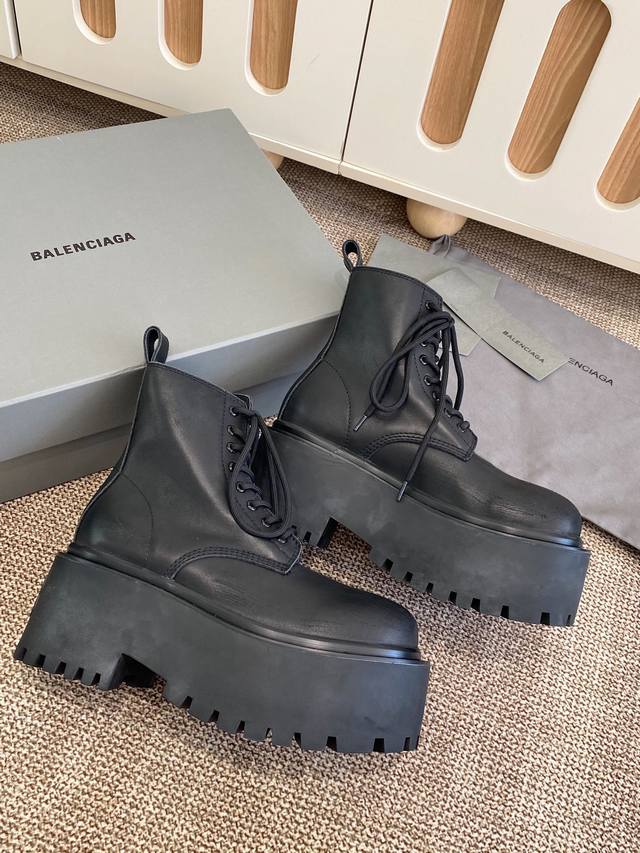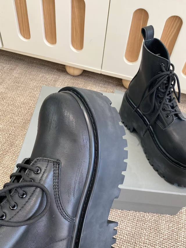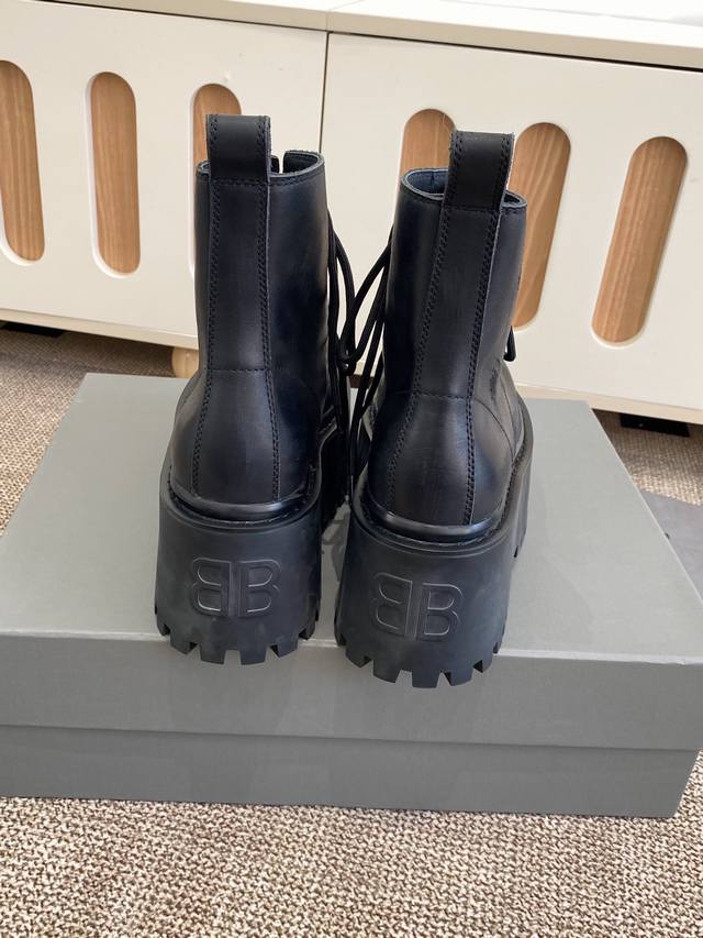Strike女士厚底短靴 雾化做旧效果短靴 鞋跟后饰以Bb标识压纹 鞋面做旧抛光处理,质感上乘,光泽内敛却又奢华尽显,脚感更是舒适与格调并存。