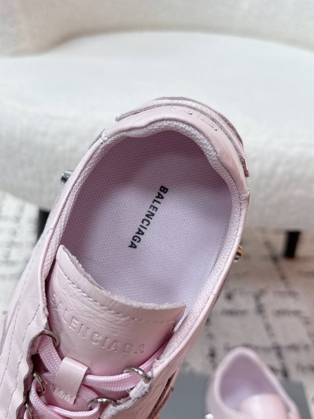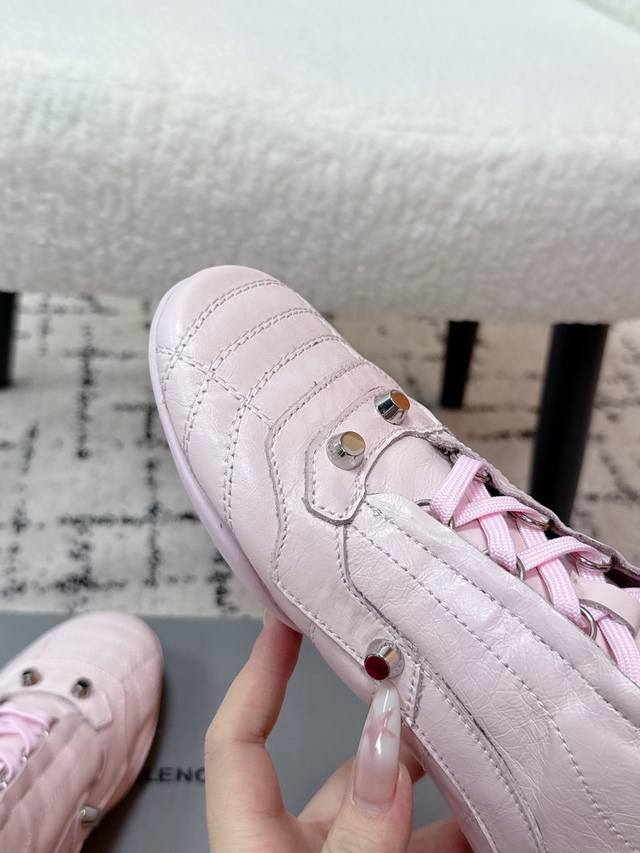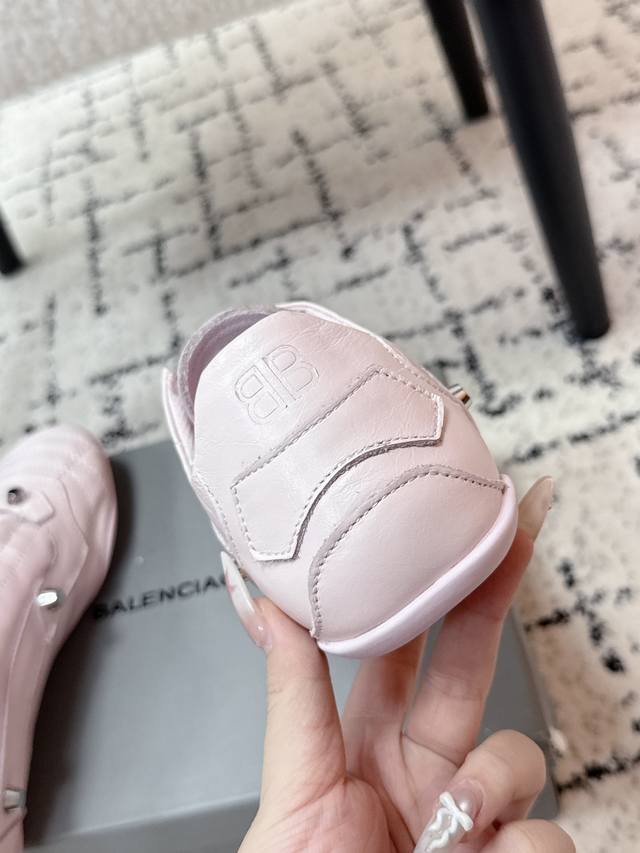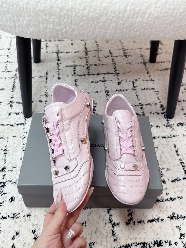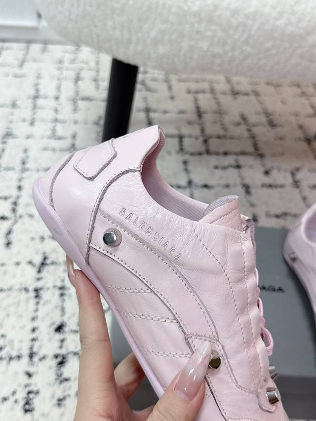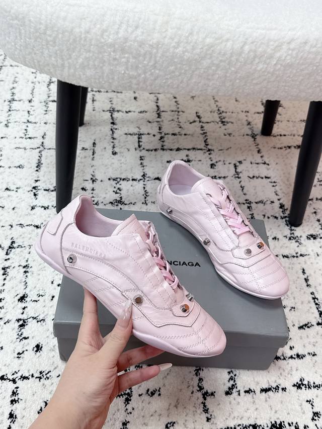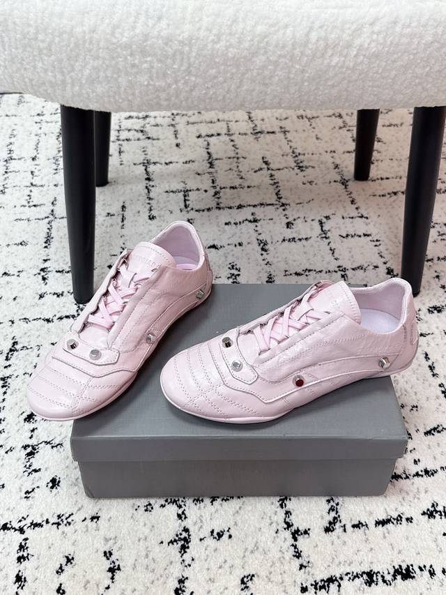 Balenciaga 巴黎世家 25 Ss 运动风 复古 德训 休闲鞋 DDD 以复古足球鞋为原型,融合巴黎世家标志性的“时装运动风”,尖头+低帮轮廓自带复古腔调,同时通过亮色 特殊材质弱化运动感,更像搭配造型的时尚单品。鞋面采用压纹皮革,自带细腻光泽和高级质感;部分颜色用了金属感涂层,增加吸睛度。 DDD 鞋身有铆钉装饰+车线纹理,既保留了足球鞋的经典元素,又通过精致工艺提升了奢华感;鞋带与鞋身同色,整体风格统一。色彩选择丰富,既可以搭休闲裤 牛仔裤走街头风,也能配裙装打造“甜酷反差感”,是近年很火的“