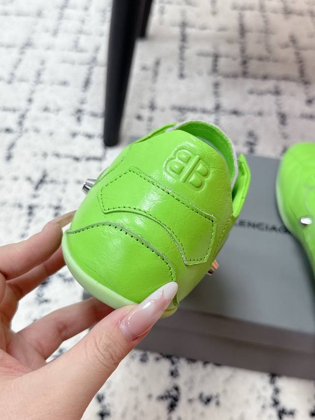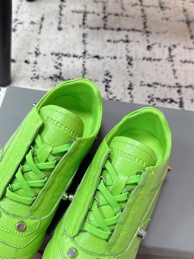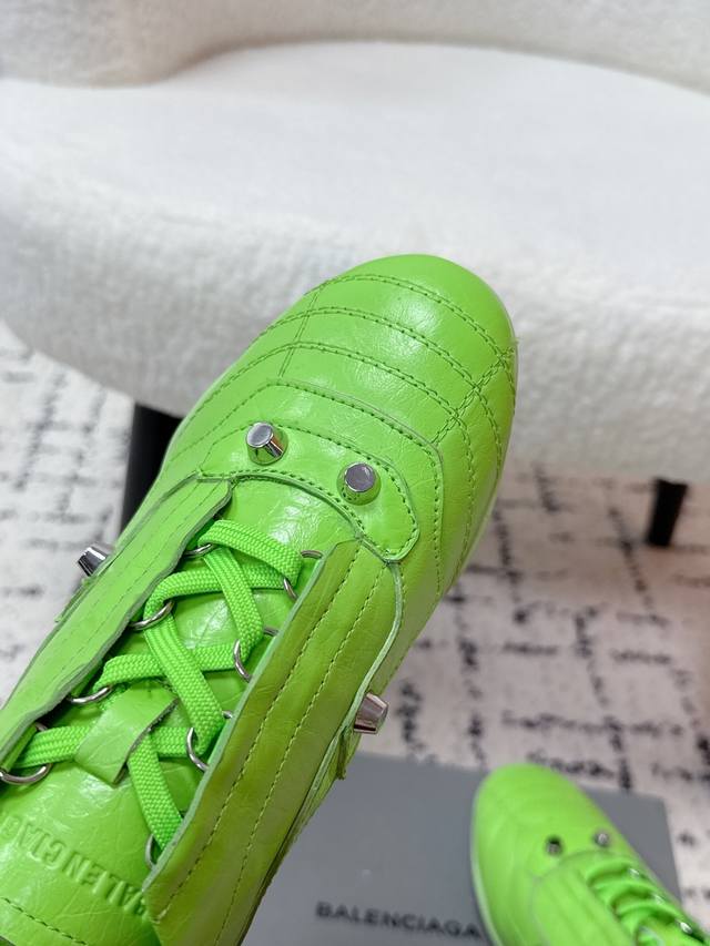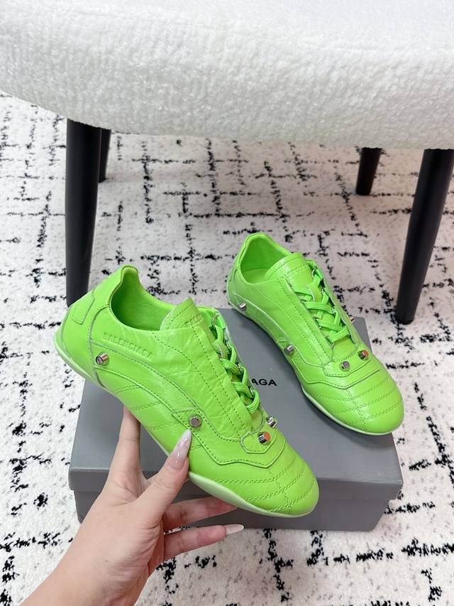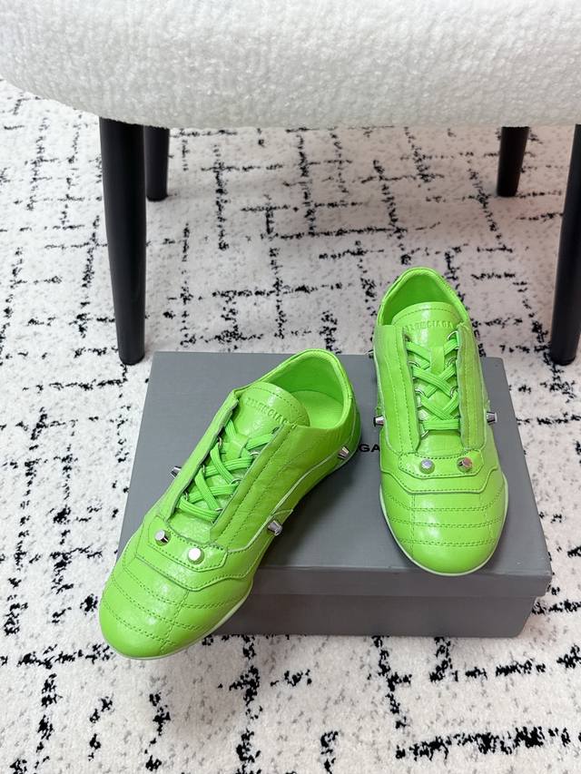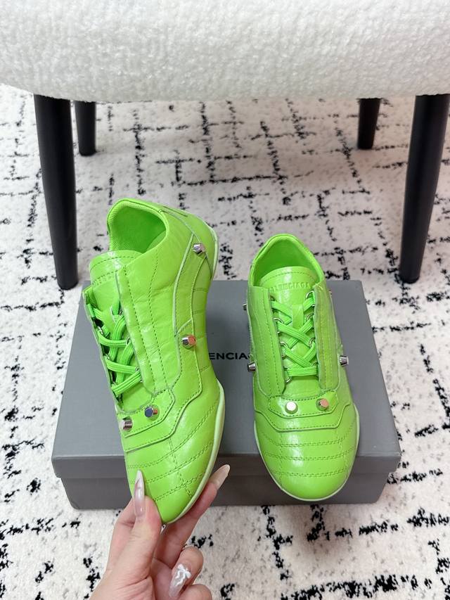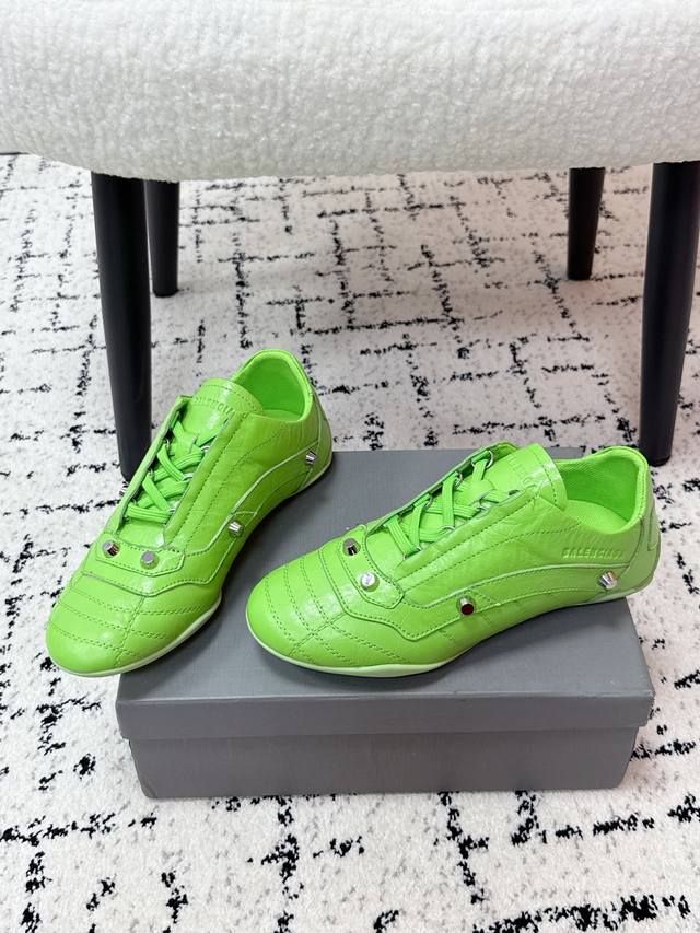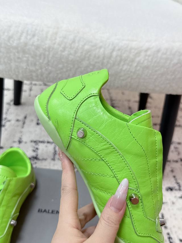 Balenciaga 巴黎世家 25 Ss 运动风 复古 德训 休闲鞋 DDD 以复古足球鞋为原型,融合巴黎世家标志性的“时装运动风”,尖头+低帮轮廓自带复古腔调,同时通过亮色 特殊材质弱化运动感,更像搭配造型的时尚单品。鞋面采用压纹皮革,自带细腻光泽和高级质感;部分颜色用了金属感涂层,增加吸睛度。 DDD 鞋身有铆钉装饰+车线纹理,既保留了足球鞋的经典元素,又通过精致工艺提升了奢华感;鞋带与鞋身同色,整体风格统一。色彩选择丰富,既可以搭休闲裤 牛仔裤走街头风,也能配裙装打造“甜酷反差感”,是近年很火的“