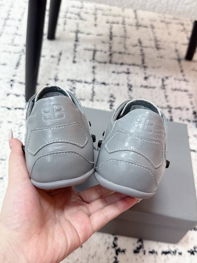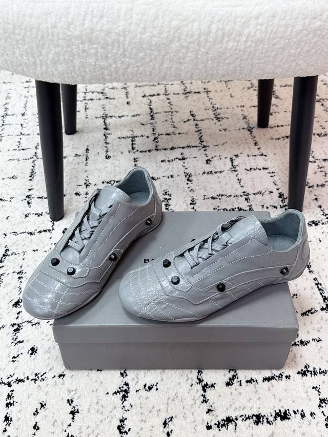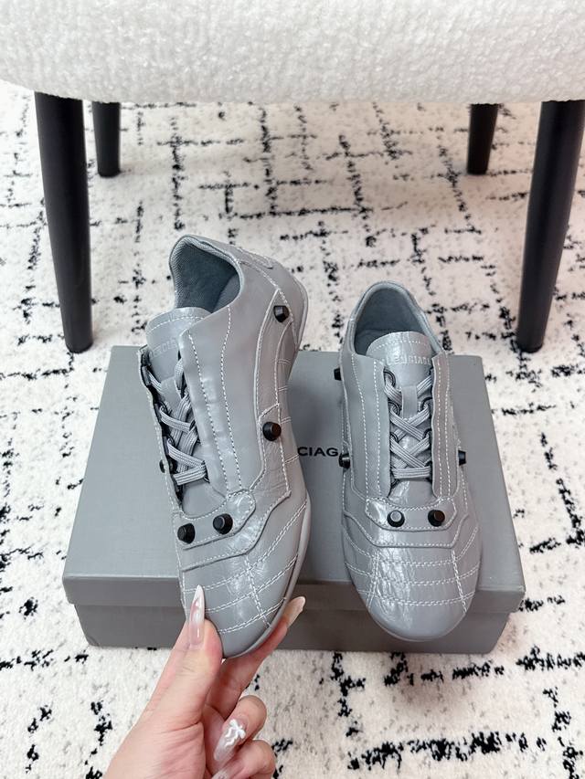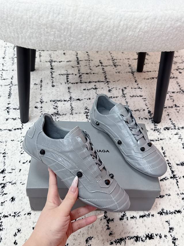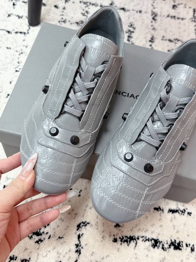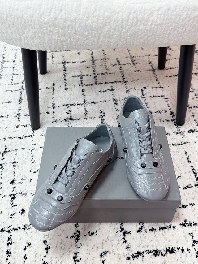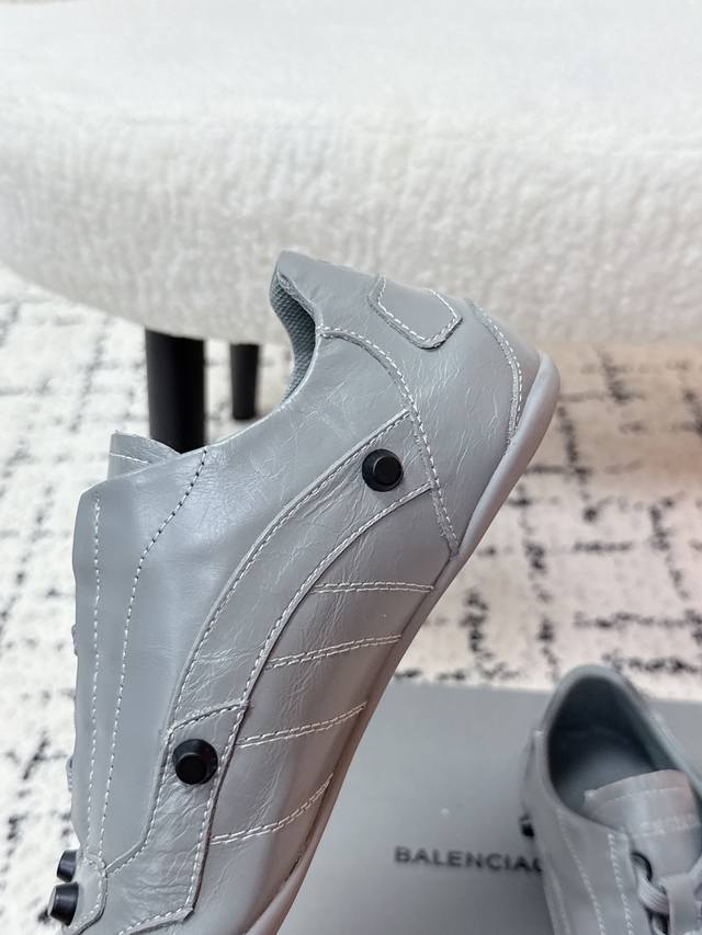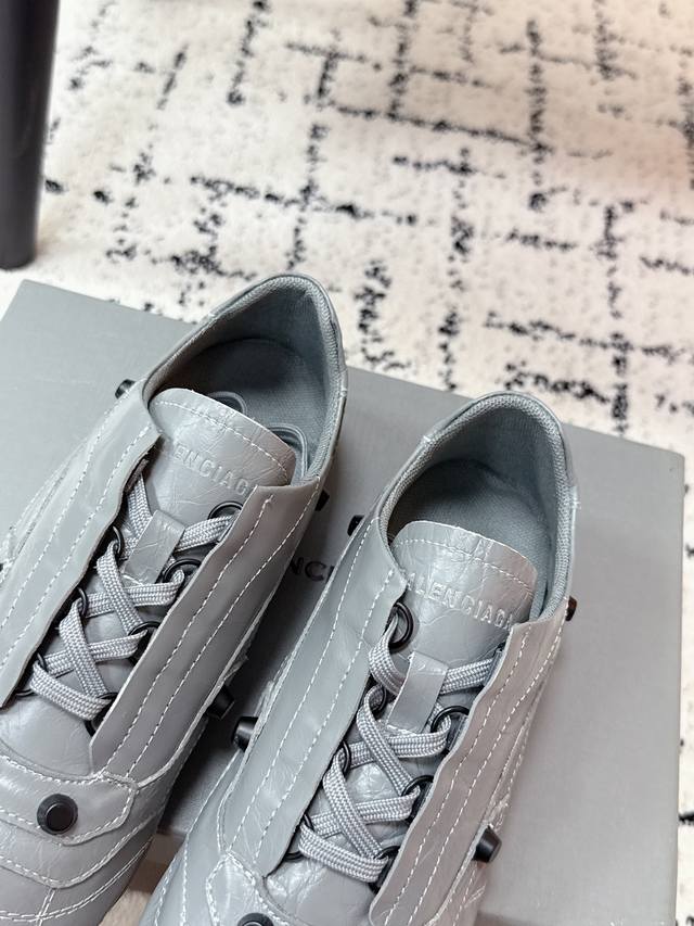 Balenciaga 巴黎世家 25 Ss 运动风 复古 德训 休闲鞋 DDD 以复古足球鞋为原型,融合巴黎世家标志性的“时装运动风”,尖头+低帮轮廓自带复古腔调,同时通过亮色 特殊材质弱化运动感,更像搭配造型的时尚单品。鞋面采用压纹皮革,自带细腻光泽和高级质感;部分颜色用了金属感涂层,增加吸睛度。 DDD 鞋身有铆钉装饰+车线纹理,既保留了足球鞋的经典元素,又通过精致工艺提升了奢华感;鞋带与鞋身同色,整体风格统一。色彩选择丰富,既可以搭休闲裤 牛仔裤走街头风,也能配裙装打造“甜酷反差感”,是近年很火的“