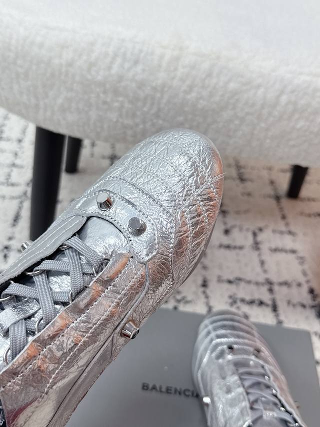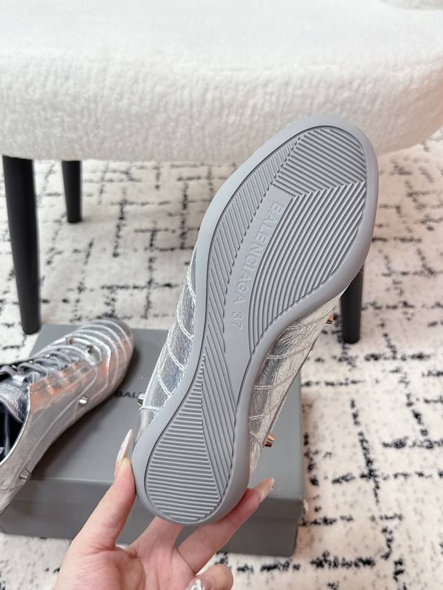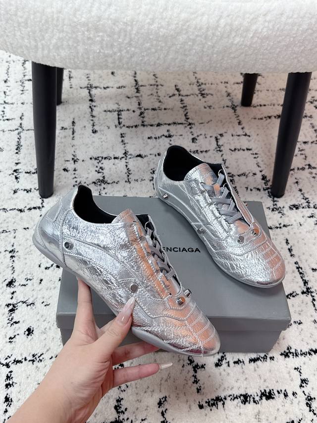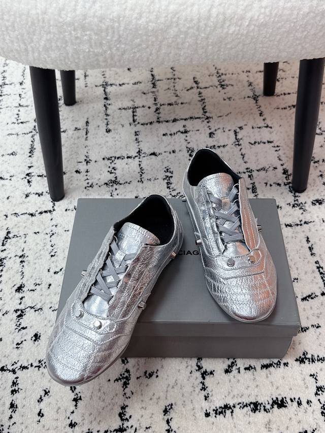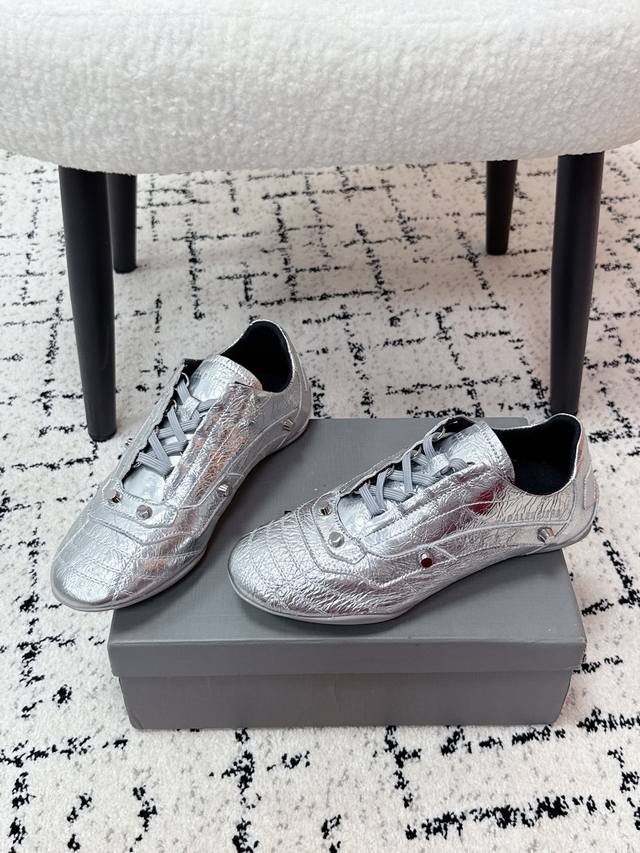 Balenciaga 巴黎世家 25 Ss 运动风 复古 德训 休闲鞋 DDD 以复古足球鞋为原型,融合巴黎世家标志性的“时装运动风”,尖头+低帮轮廓自带复古腔调,同时通过亮色 特殊材质弱化运动感,更像搭配造型的时尚单品。鞋面采用压纹皮革,自带细腻光泽和高级质感;部分颜色用了金属感涂层,增加吸睛度。 DDD 鞋身有铆钉装饰+车线纹理,既保留了足球鞋的经典元素,又通过精致工艺提升了奢华感;鞋带与鞋身同色,整体风格统一。色彩选择丰富,既可以搭休闲裤 牛仔裤走街头风,也能配裙装打造“甜酷反差感”,是近年很火的“