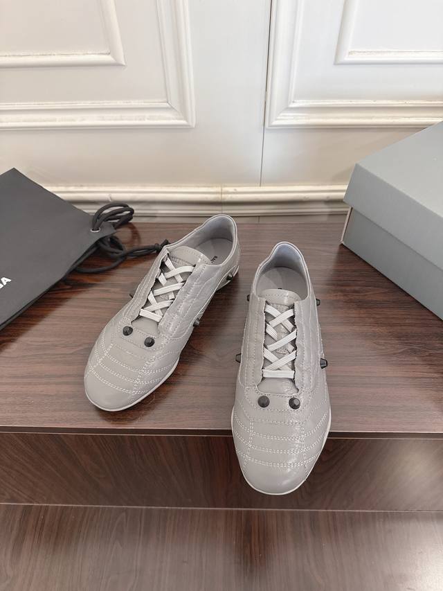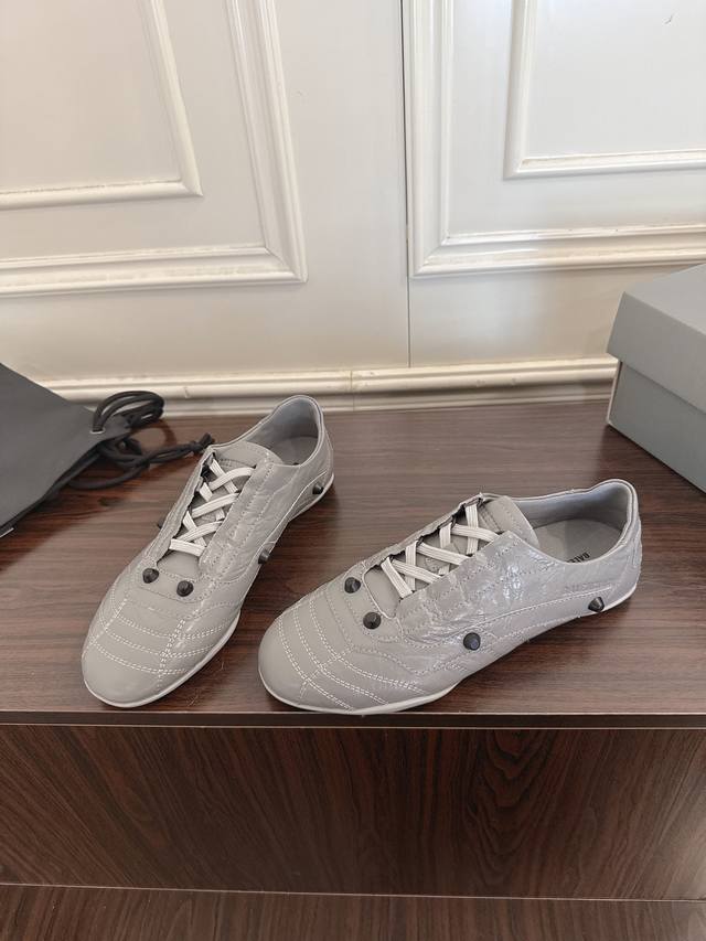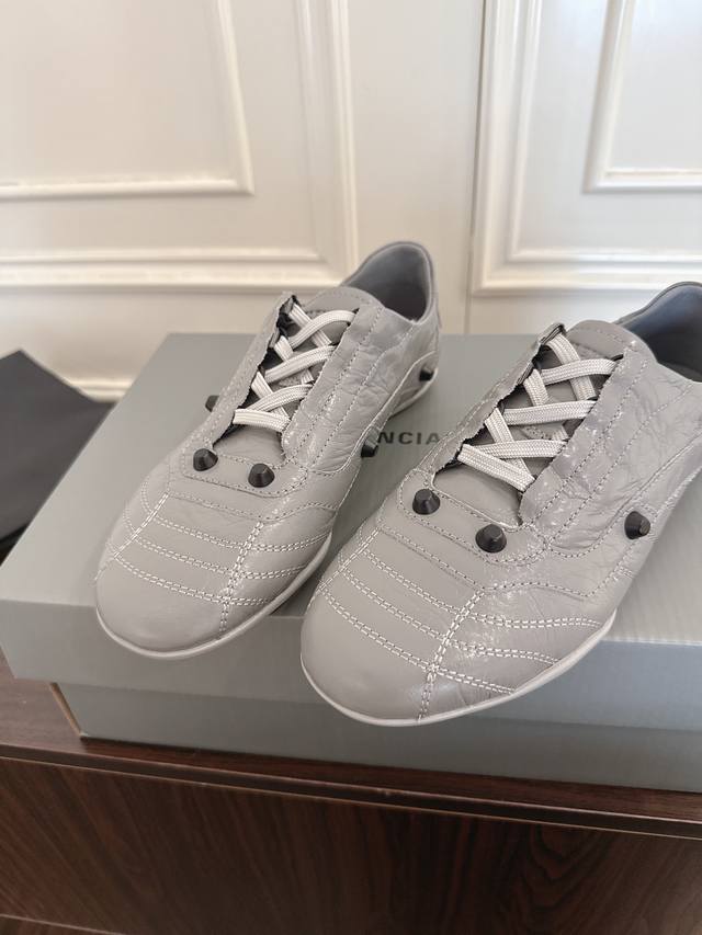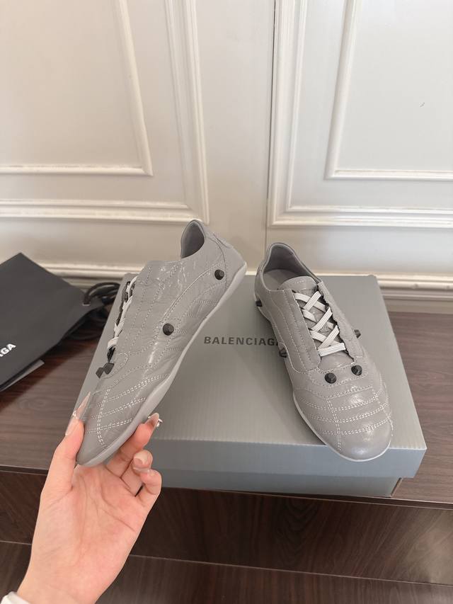 FFF Balenciaga 巴黎世家F028 2026Ss早春新款复古风休闲运动鞋德训鞋 DDD 以复古足球鞋为原型,融合巴黎世家标志性的“时装运动风”,尖头+低帮轮廓自带复古腔调,同时通过亮色 特殊材质弱化运动感,更像搭配造型的时尚单品。鞋面采用压纹皮革,自带细腻光泽和高级质感;部分颜色用了金属感涂层,增加吸睛度。 DDD 鞋身有铆钉装饰+车线纹理,既保留了足球鞋的经典元素,又通过精致工艺提升了奢华感;鞋带与鞋身同色,整体风格统一。色彩选择丰富,既可以搭休闲裤 牛仔裤走街头风,也能配裙装打造“甜酷反差
